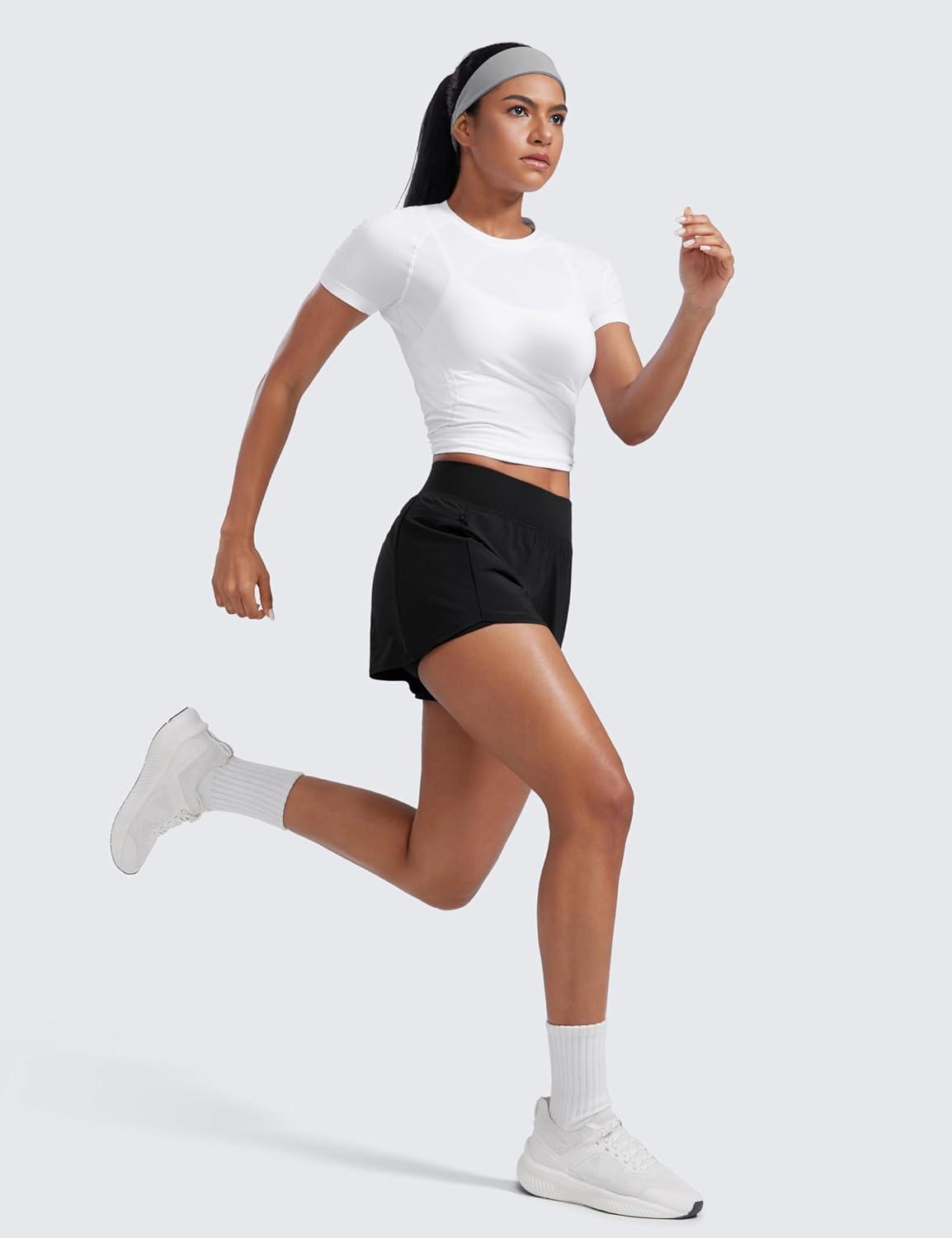 CRZ YOGA 2 in 1 Double Layer Running Shorts for Women 3″ – High Waisted for Athletic Tennis Workout with Zip Pockets(Black)
