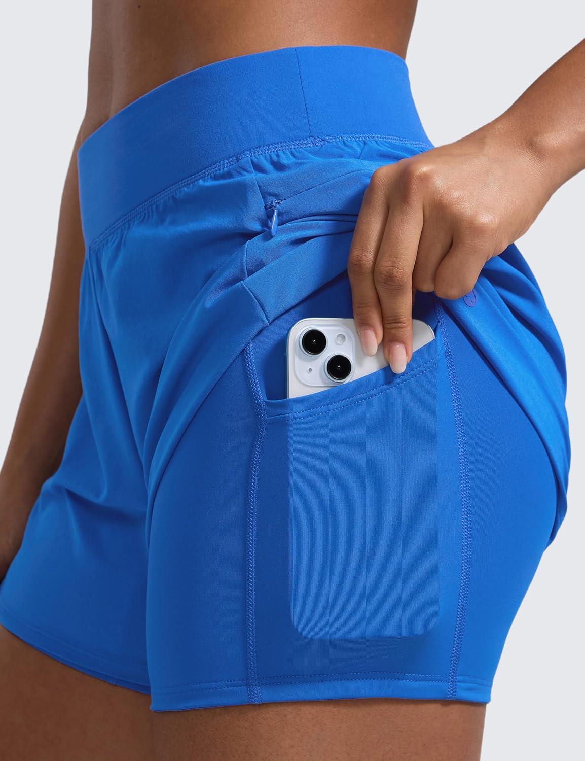 CRZ YOGA 2 in 1 Double Layer Running Shorts for Women 3″ – High Waisted for Athletic Tennis Workout with Zip Pockets(Sparkle Blue)