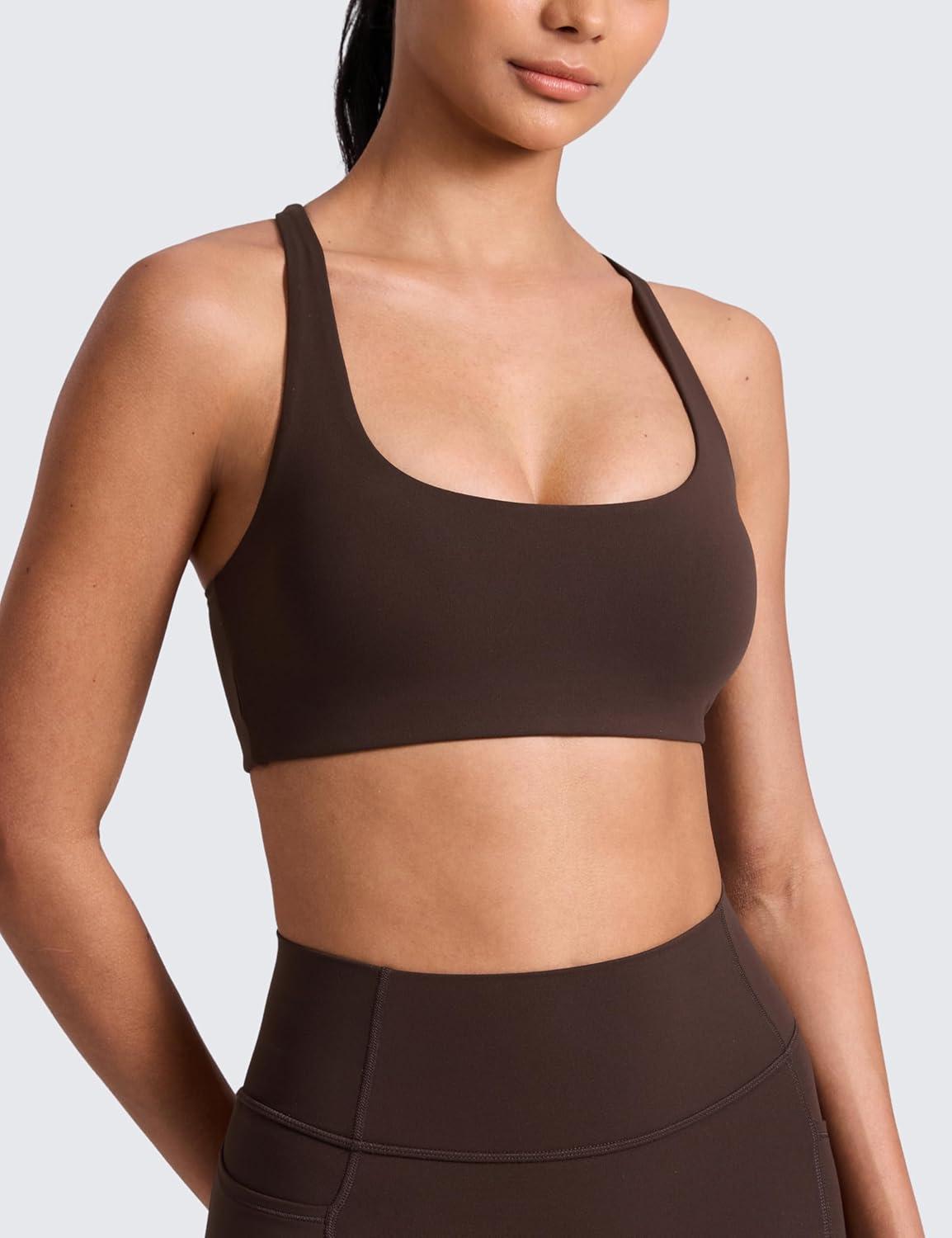 CRZ YOGA Butterlift Cross Back Sports Bras for Women – Scoop Neck Adjustable Straps Wireless Padded Pilates Workout Top(Hot Fudge Brown)
