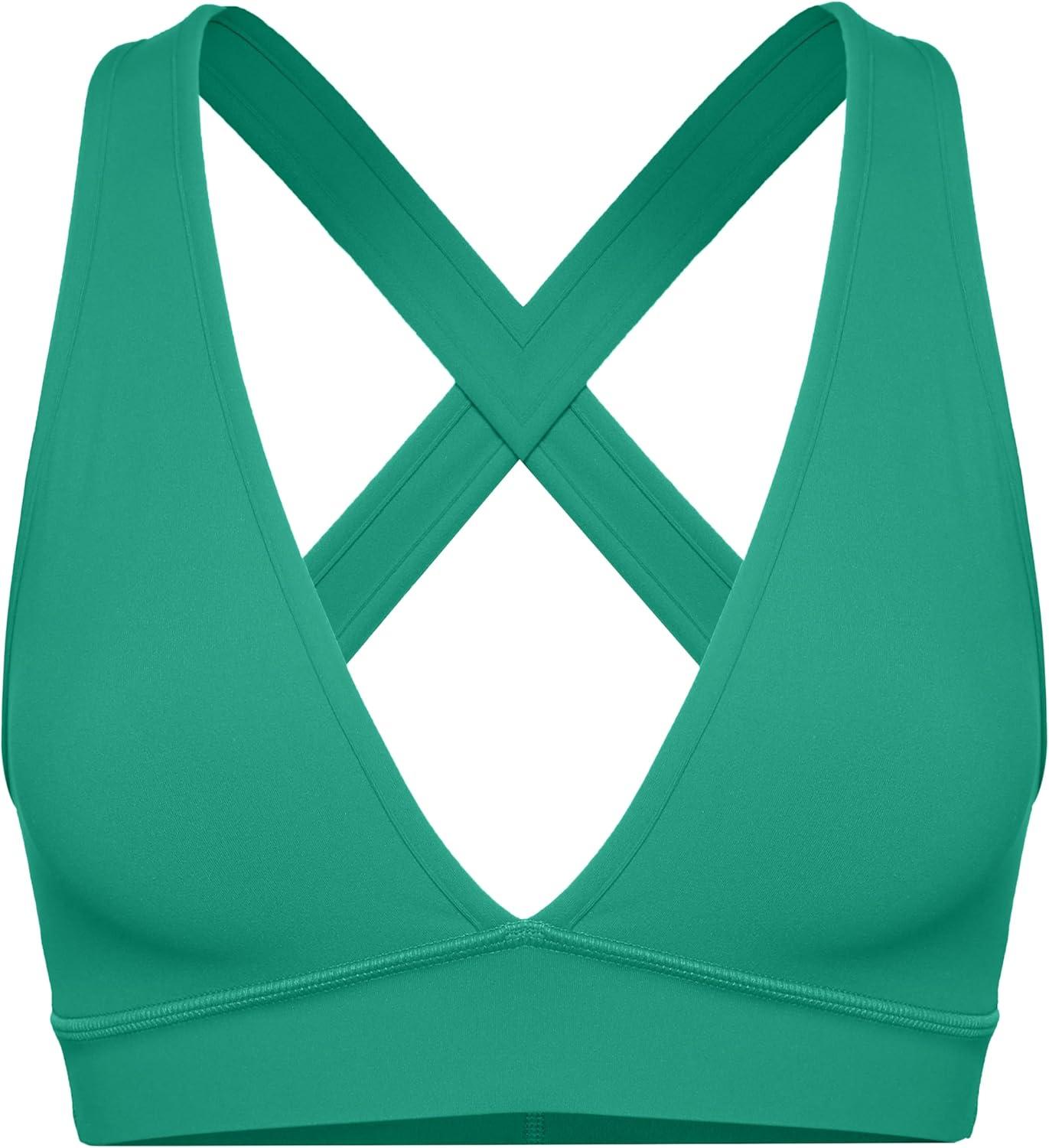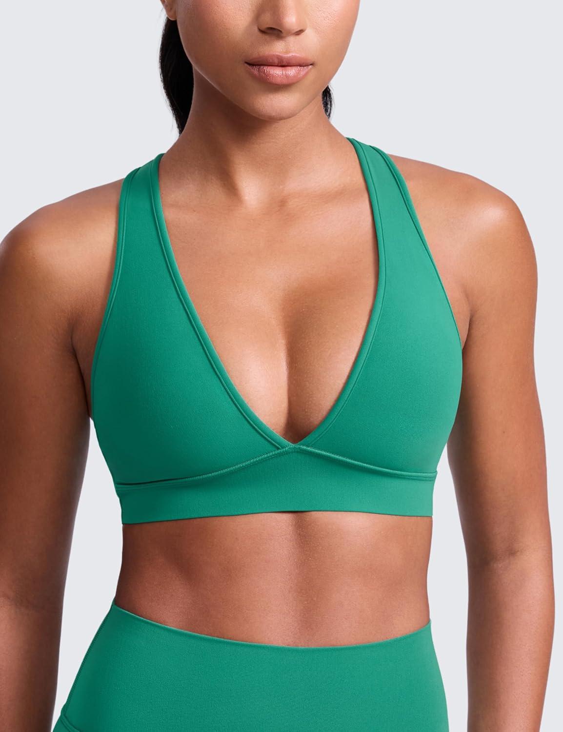 CRZ YOGA Butterlift Deep V Neck Sports Bras for Women – Padded Gym Wide Straps Cut-Out Cross Back Crop Pilates Workout Top(Cascadia Green)