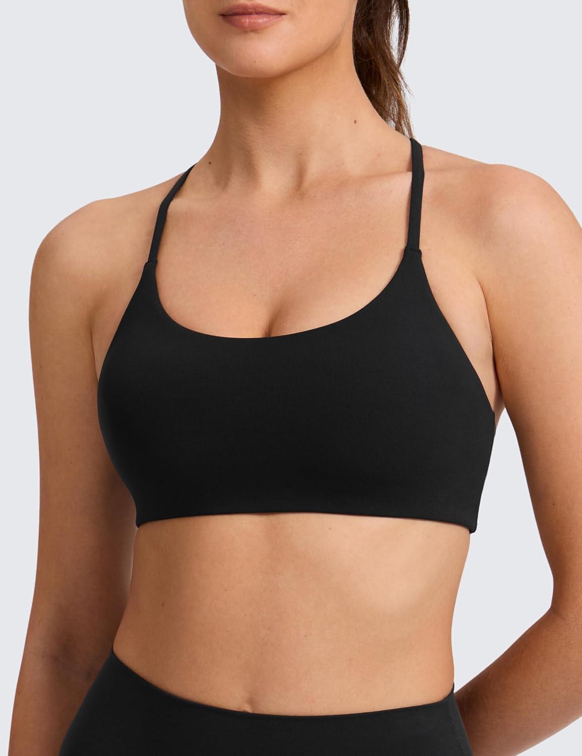 CRZ YOGA Butterlift Double Lined V Back Sports Bras for Women - Scoop Neck Spaghetti Strap Wireless Yoga Top Non Padded(Black)