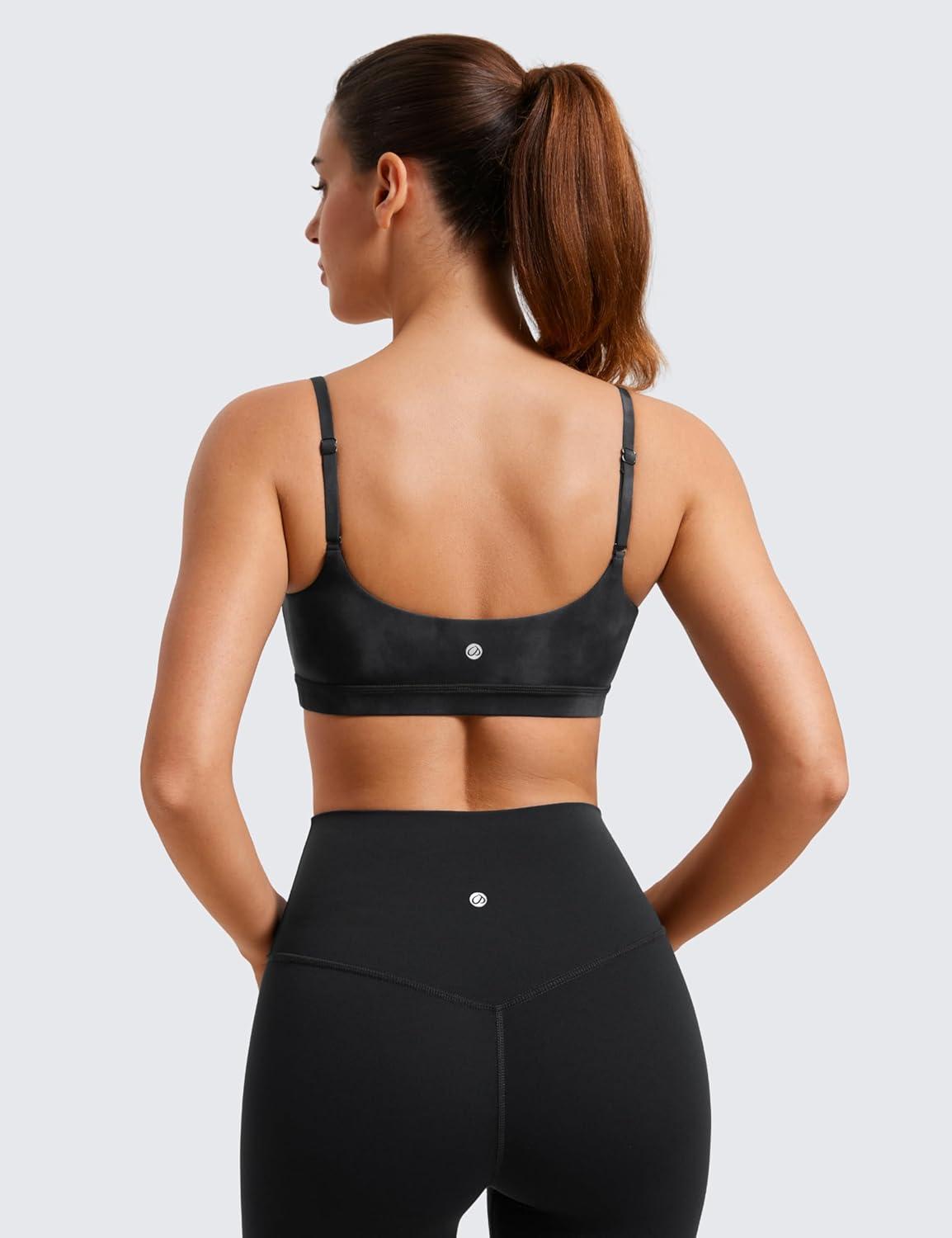 CRZ YOGA Butterluxe Adjustable Spaghetti Strap Sports Bras for Women – Scoop Neck Wireless Padded Yoga Workout Crop Top(Black Foil Pattern)