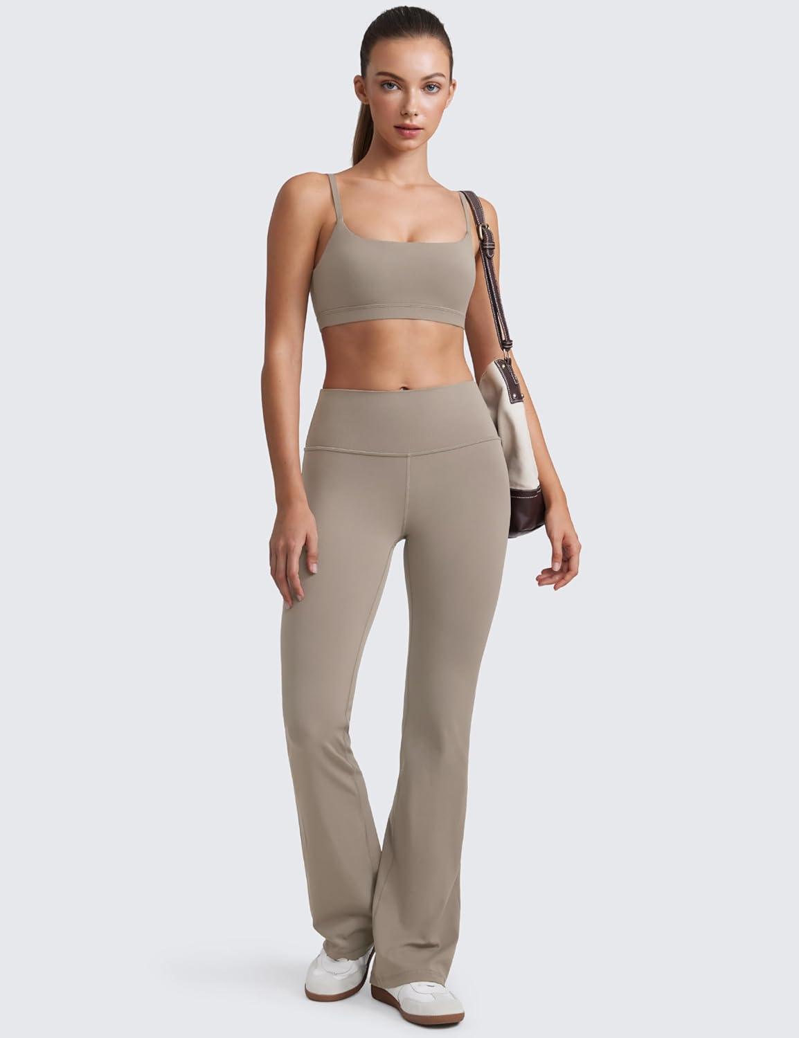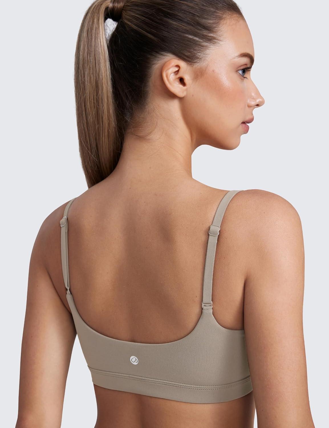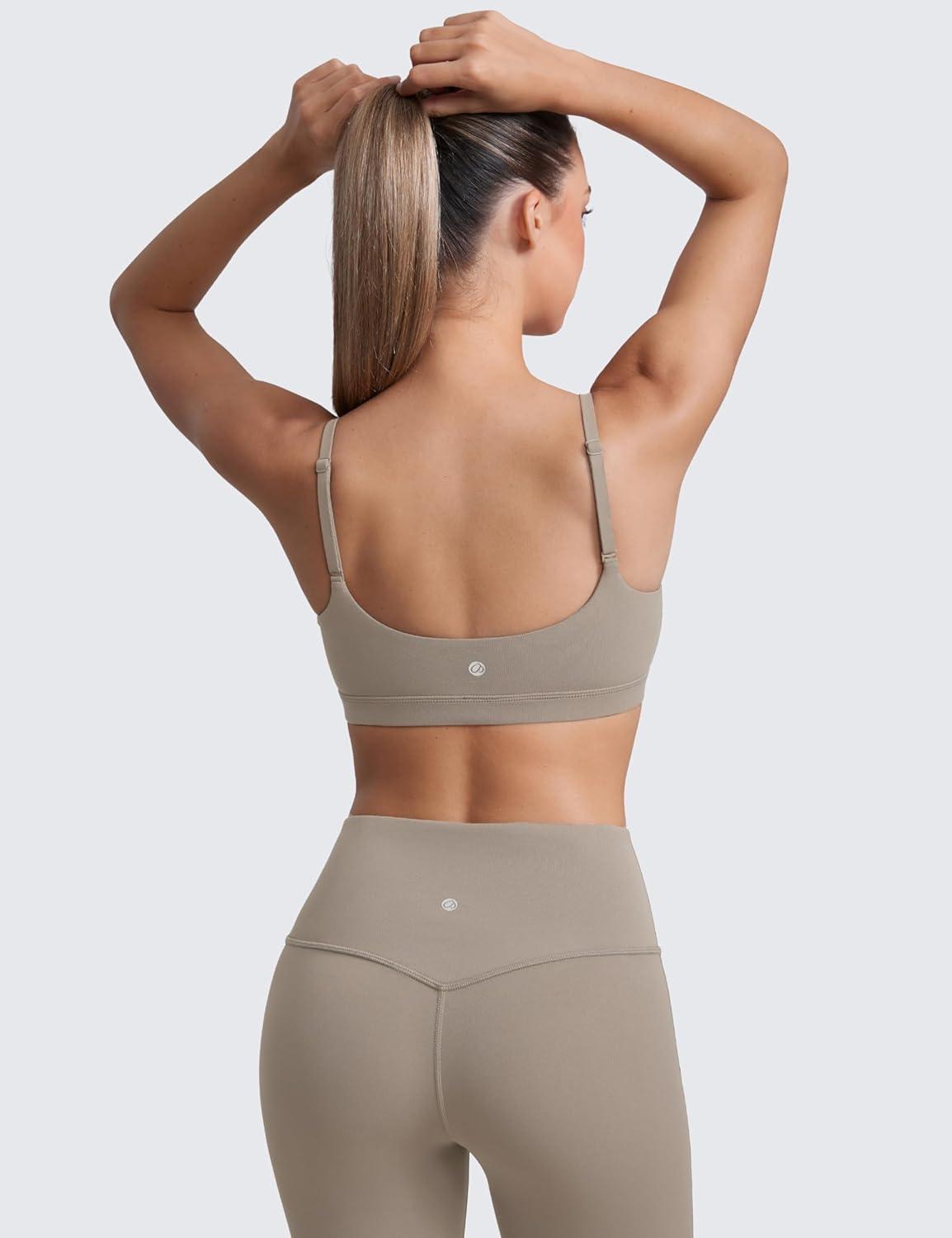 CRZ YOGA Butterluxe Adjustable Spaghetti Strap Sports Bras for Women – Scoop Neck Wireless Padded Yoga Workout Crop Top(Mojave Tan)