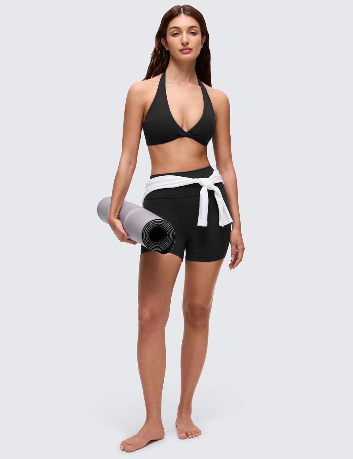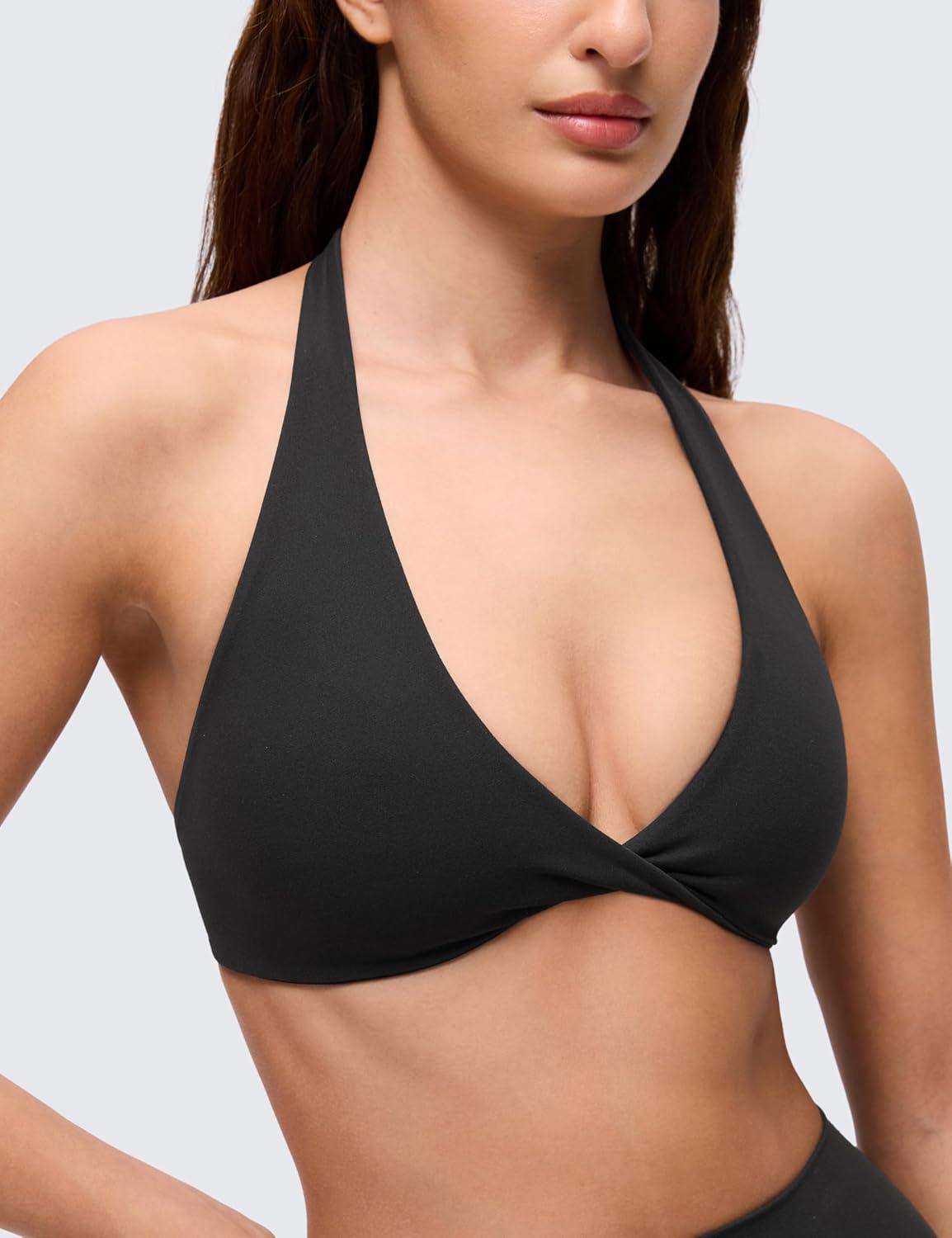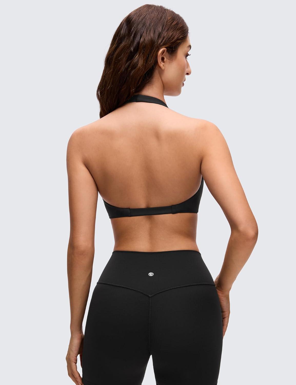 CRZ YOGA Butterluxe Double Lined Twist Halter Sports Bras for Women – Deep V Neck Crop Top Casual Open Back Non Padded(Black)