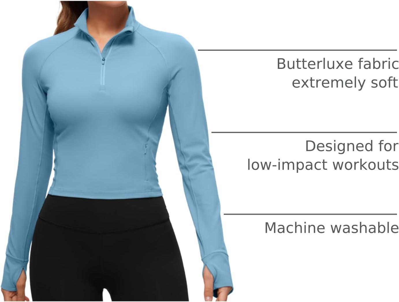 CRZ YOGA Butterluxe Half Zip Long Sleeve Shirts for Women – Workout Athletic Yoga Tops Crop Collared Quarter Zipper T-Shirt(Pure Blue)