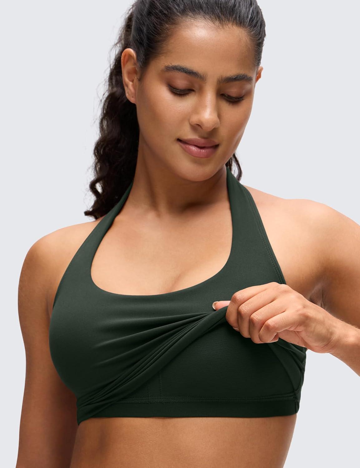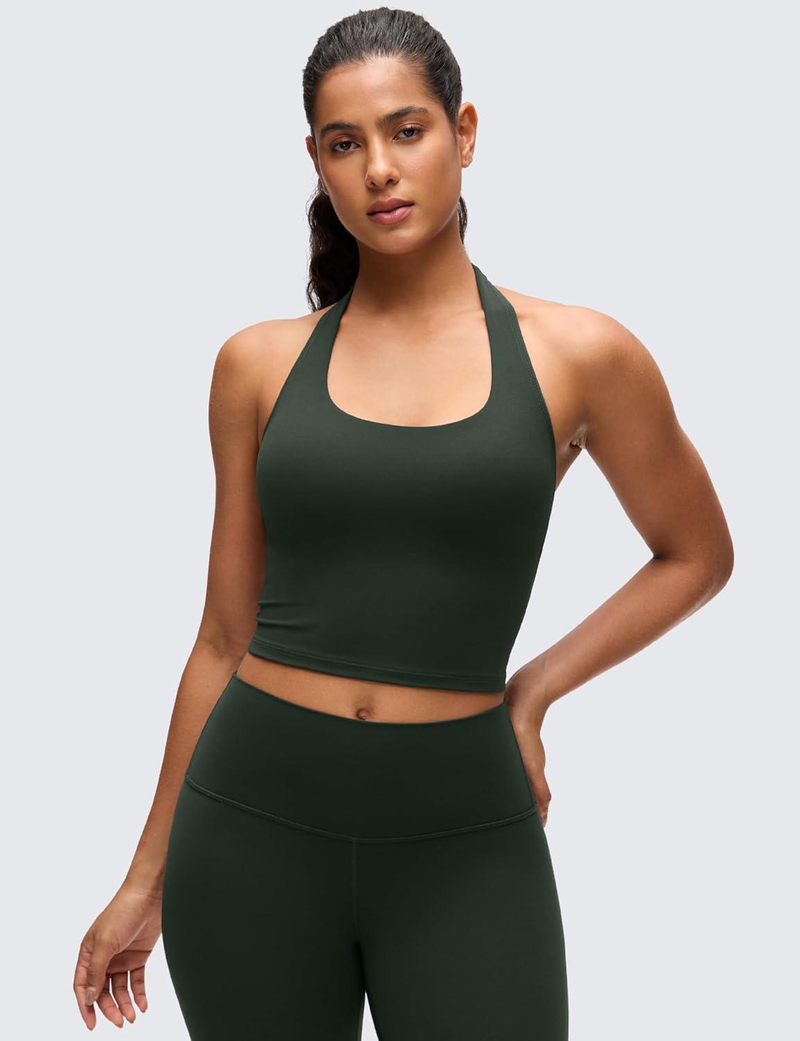 CRZ YOGA Butterluxe Halter Crop Tank Tops for Women – Open Back Padded Longline Sports Bras Workout Gym(Legend Green)