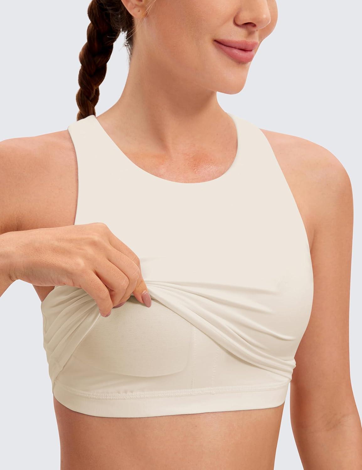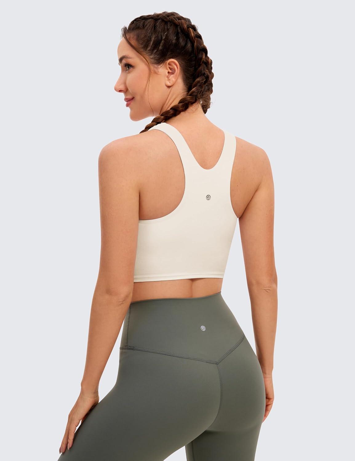CRZ YOGA Butterluxe High Neck Crop Tank Tops for Women – Racerback Padded Longline Sports Bras Workout(White Apricot)