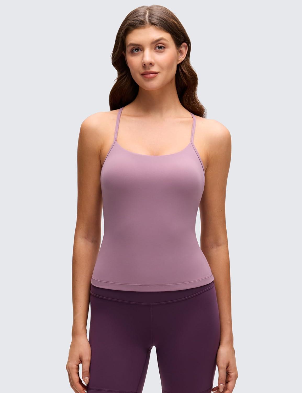 CRZ YOGA Butterluxe Racerback Tank Tops for Women – Scoop Neck Spaghetti Strap Padded Workout Camisole with Built in Bra(Ripe Plum)