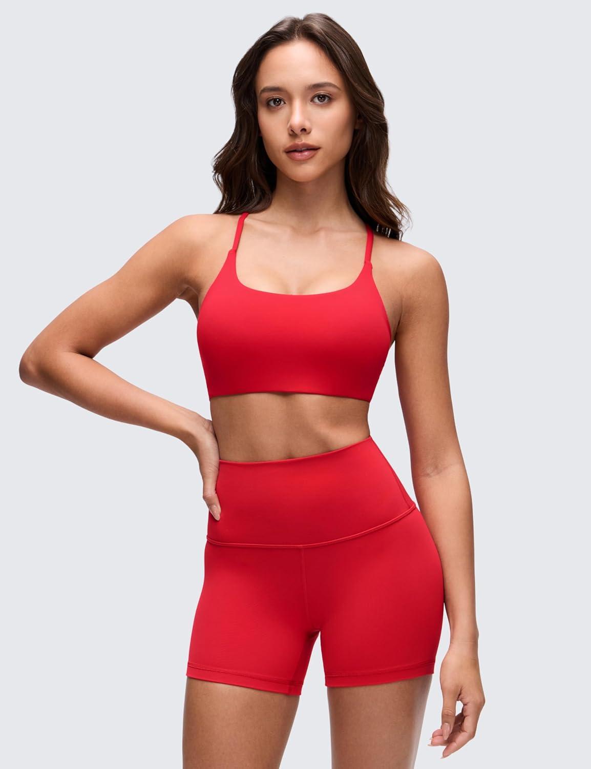 CRZ YOGA Butterluxe Twist Cross Back Sports Bras for Women – U Neck Padded Adjustable Spaghetti Straps Yoga Top(Aurora Red)