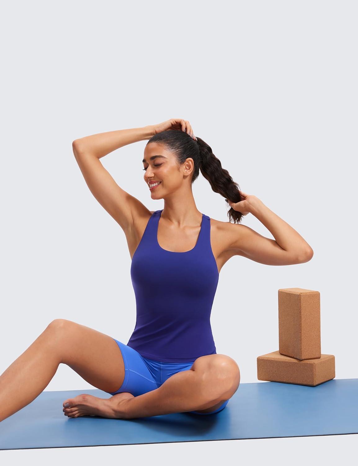 CRZ YOGA Butterluxe Workout Racerback Tank Tops for Women – Padded Athletic Spandex Yoga Shirts with Built in Bra(Larkspur Blue)