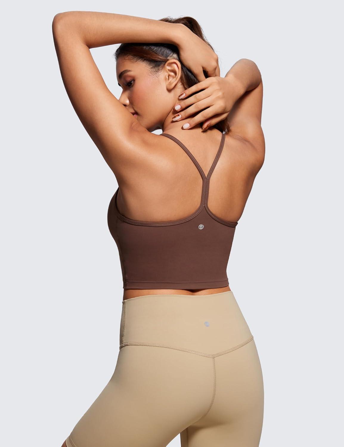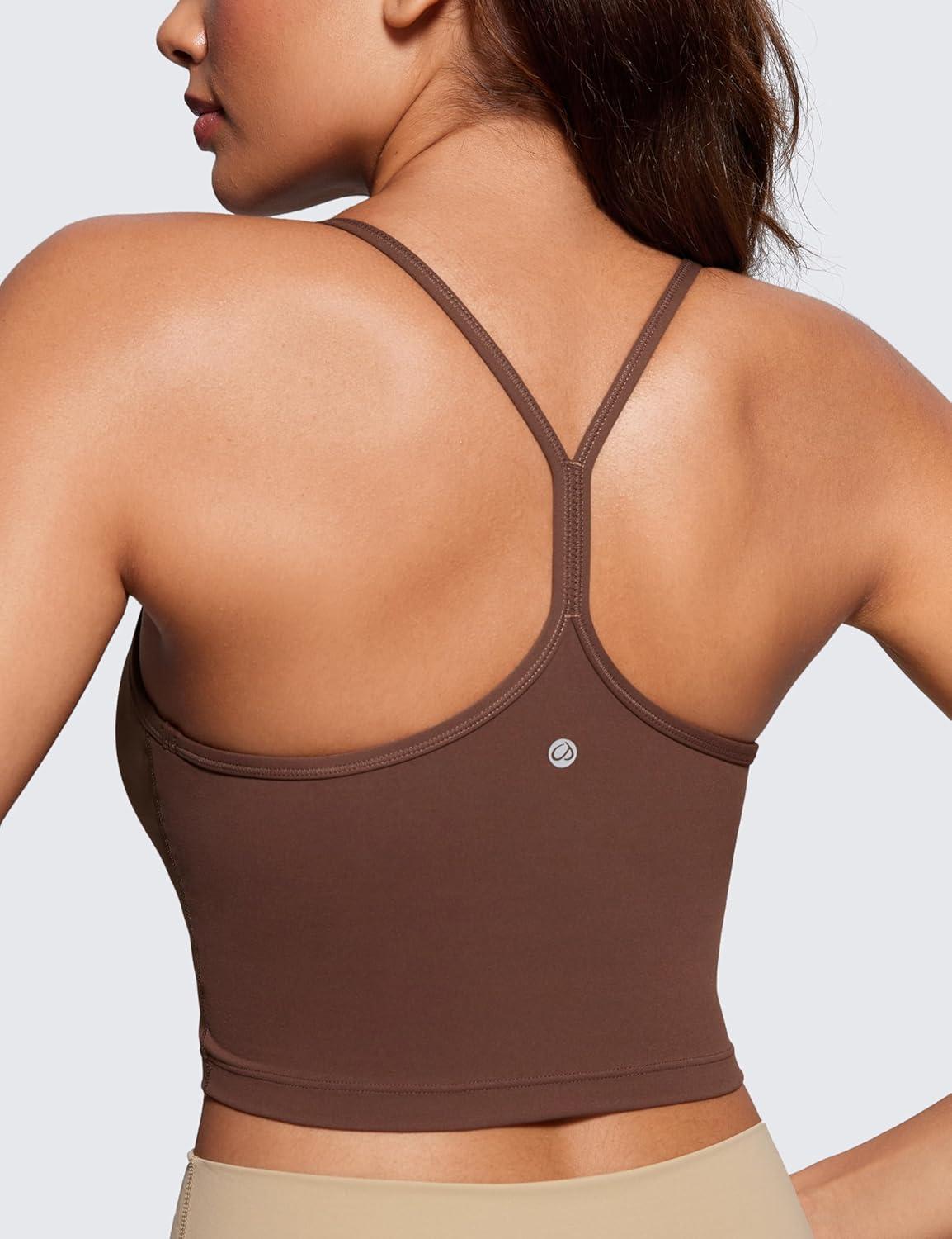 CRZ YOGA Butterluxe Y Back Crop Tank Tops for Women – Spaghetti Straps Racerback Padded Yoga Workout Longline Sports Bras(Coffee Brown)