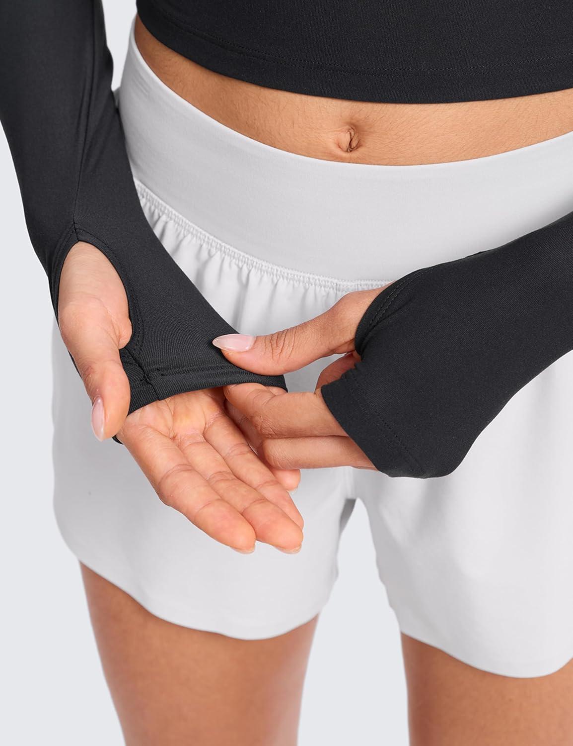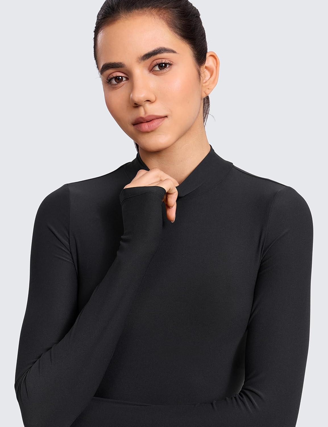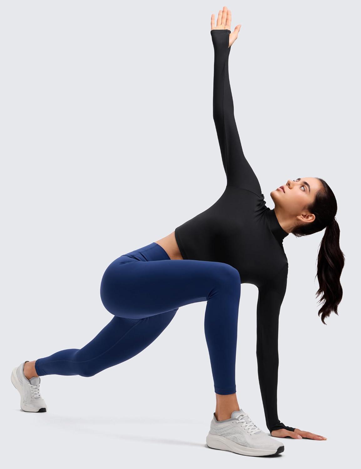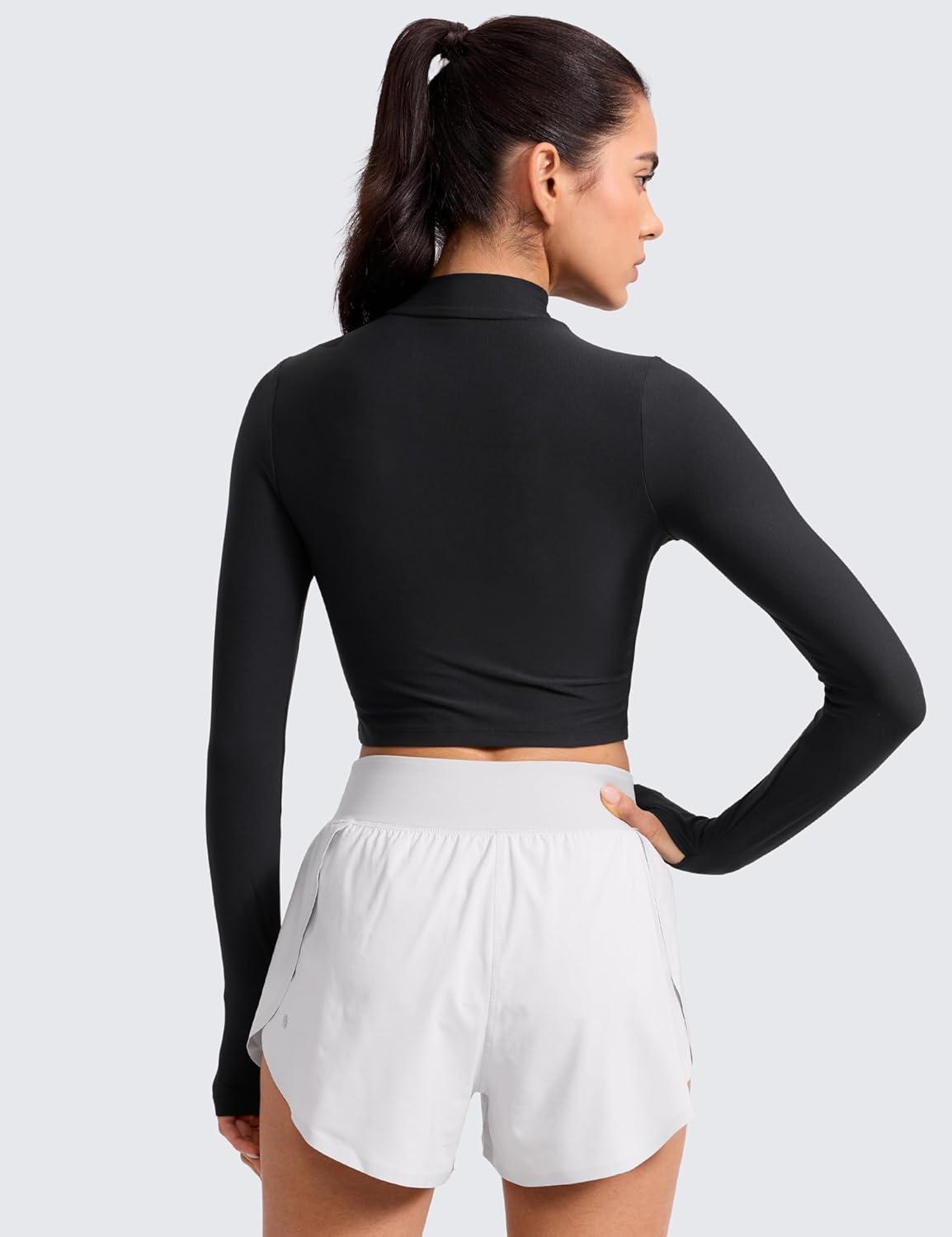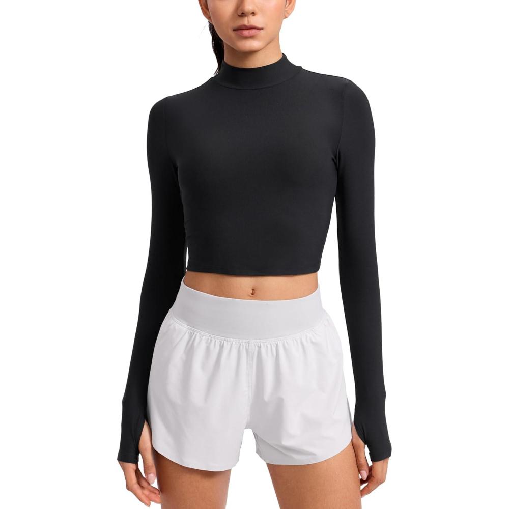 CRZ YOGA Cloudweight Crop Mock Neck Shirts for Women – Workout Athletic Gym Long Sleeve Tops Soft T-Shirt with Thumb Hole(Black)