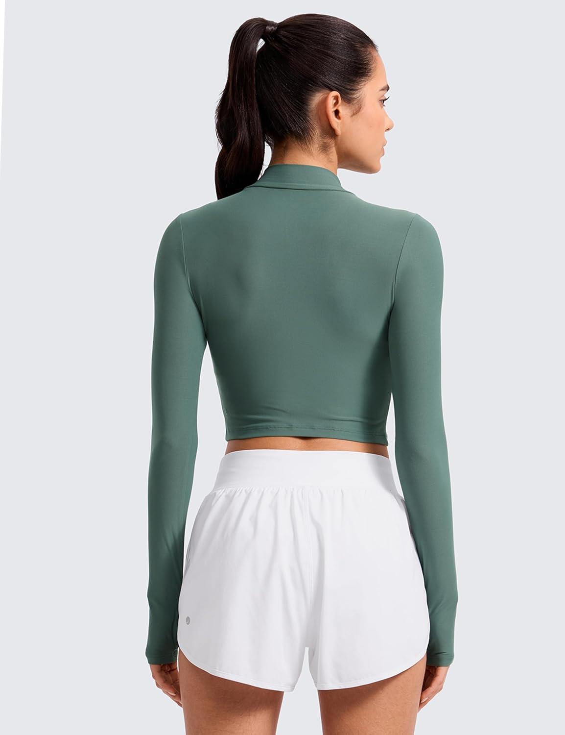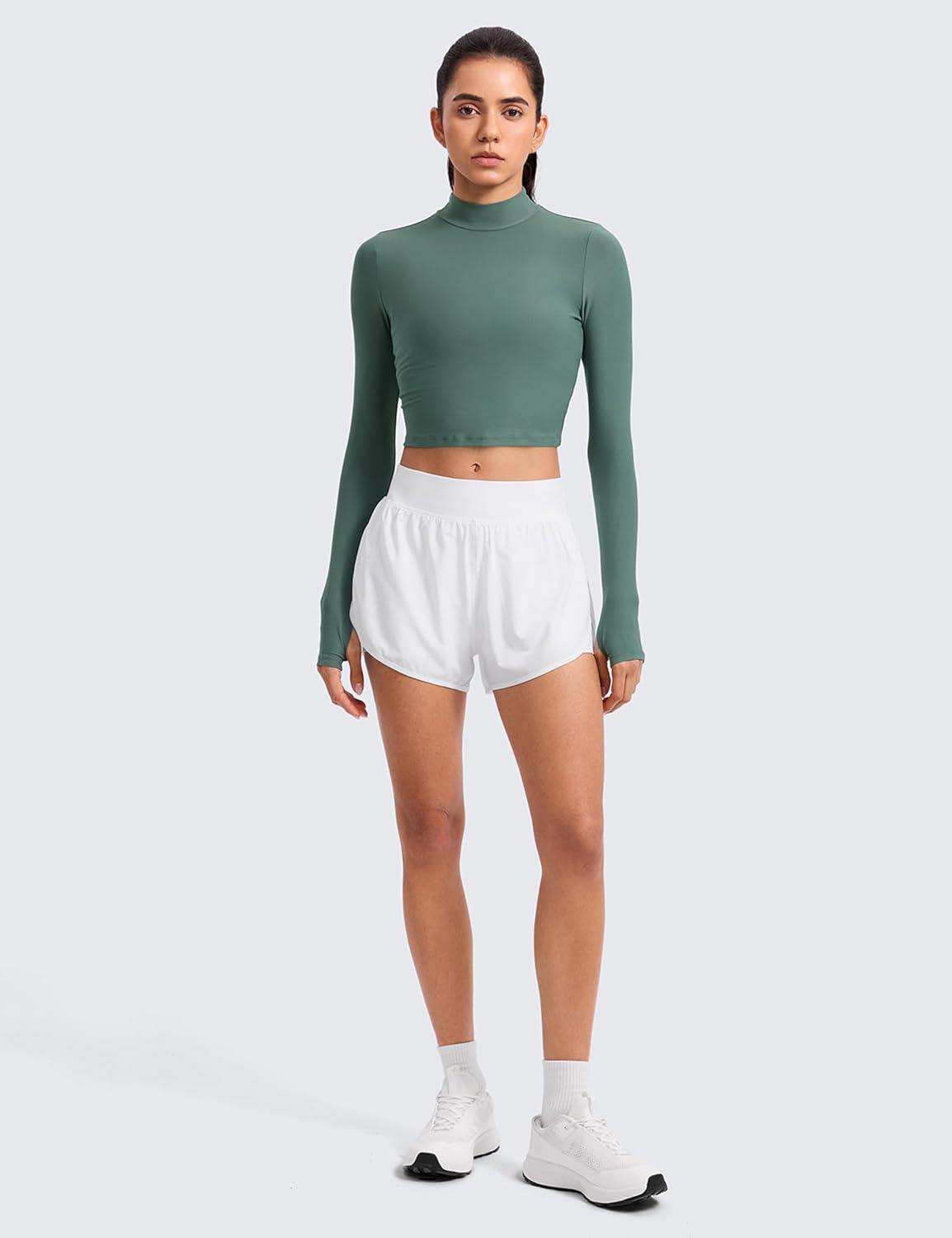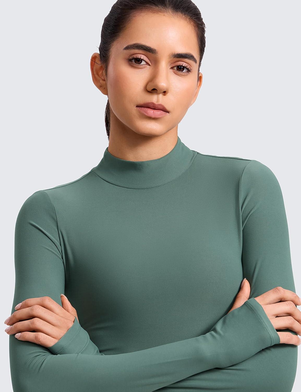 CRZ YOGA Cloudweight Crop Mock Neck Shirts for Women - Workout Athletic Gym Long Sleeve Tops Soft T-Shirt with Thumb Hole(Graphite Green)