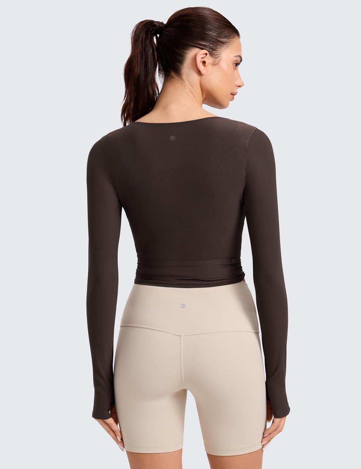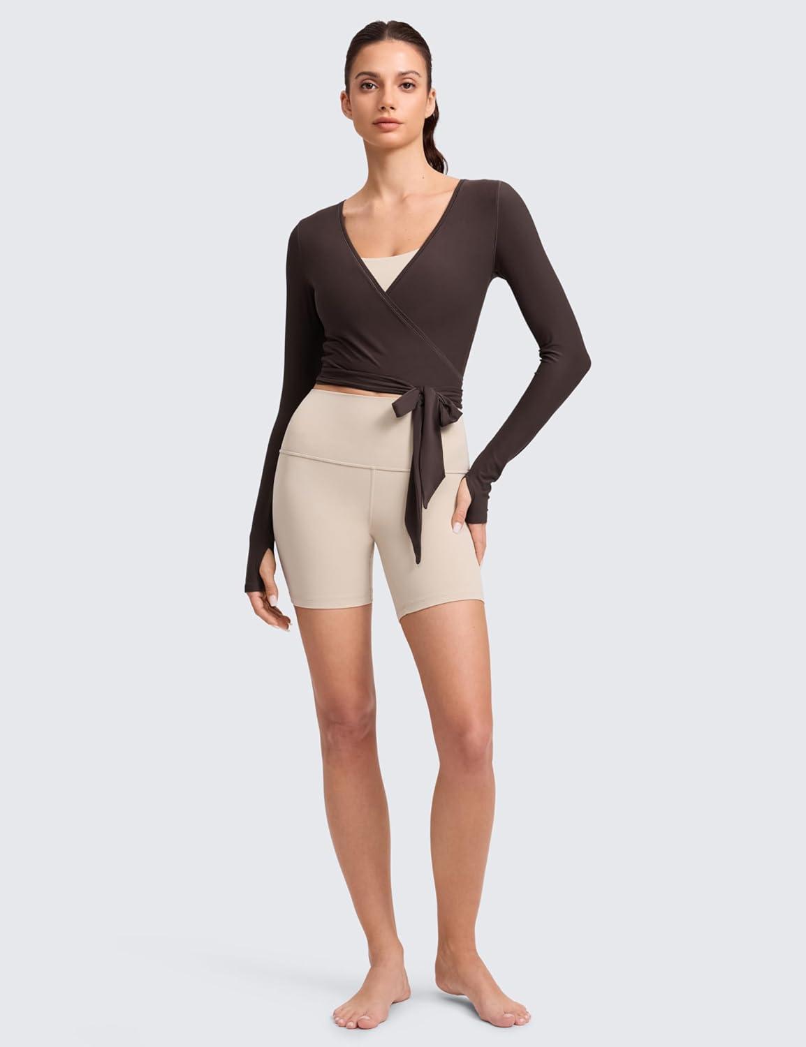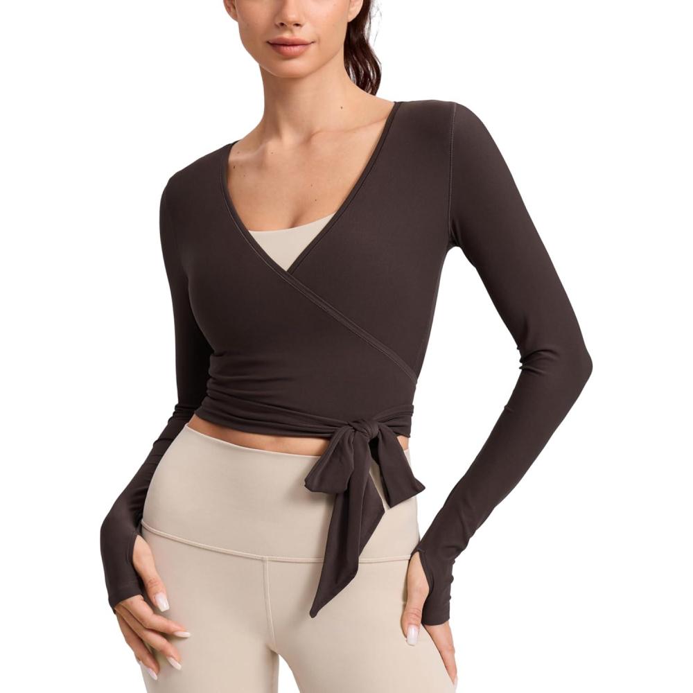 CRZ YOGA Cloudweight Wrap Shirts for Women – Workout Yoga Pilates Casual Long Sleeve Tops Cross V Neck Tie Soft Tees(Hot Fudge Brown)
