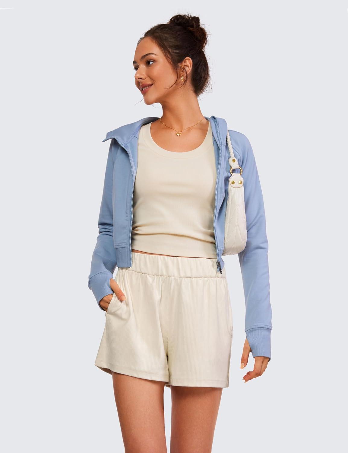 CRZ YOGA Comfy Ribbed Sweat Shorts for Women 3″ – High Waisted Lyocell for Casual Lounge Athletic Jersey with Pockets(White Apricot)