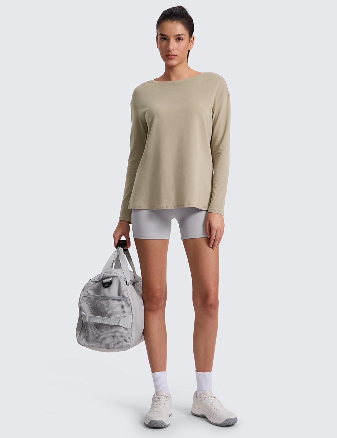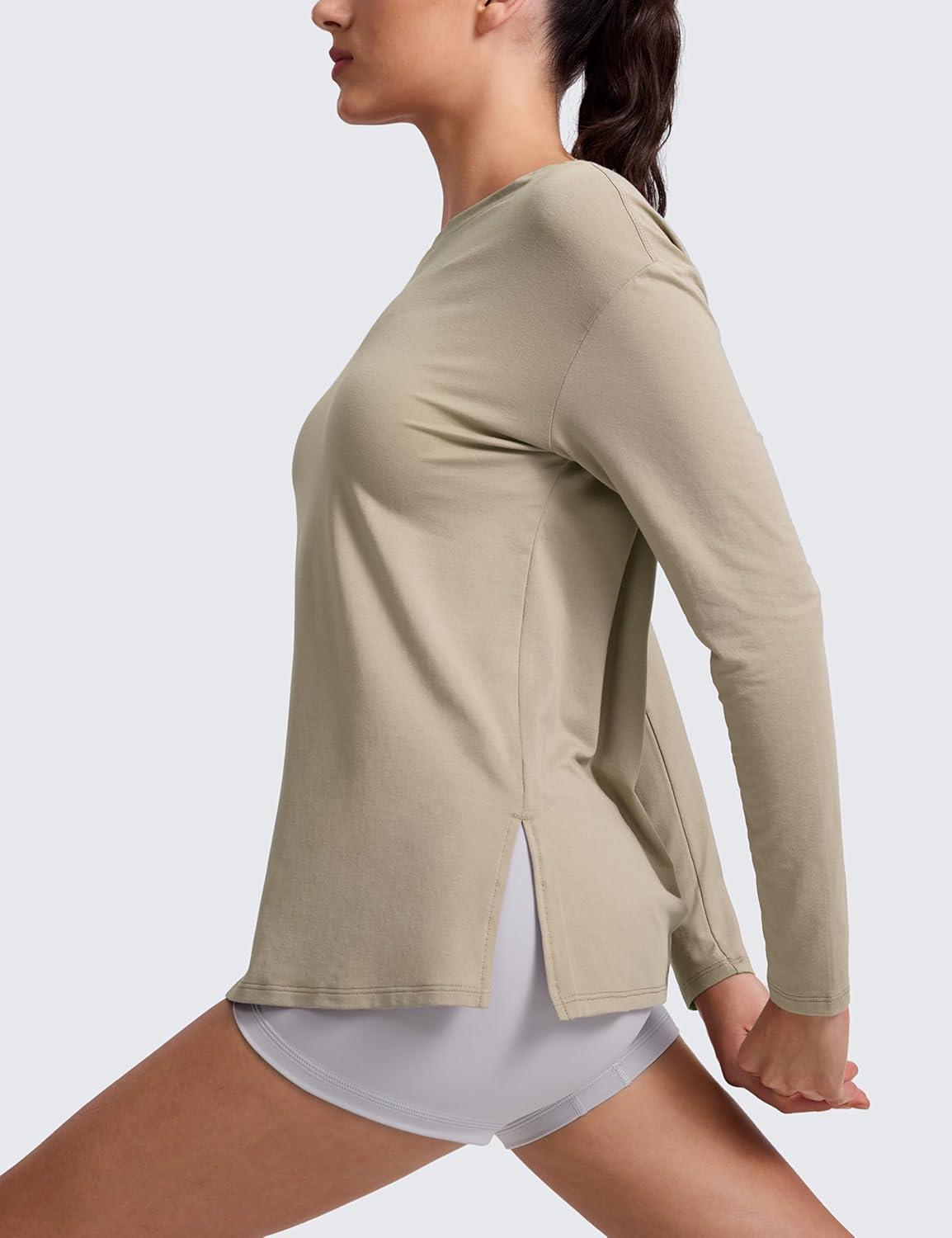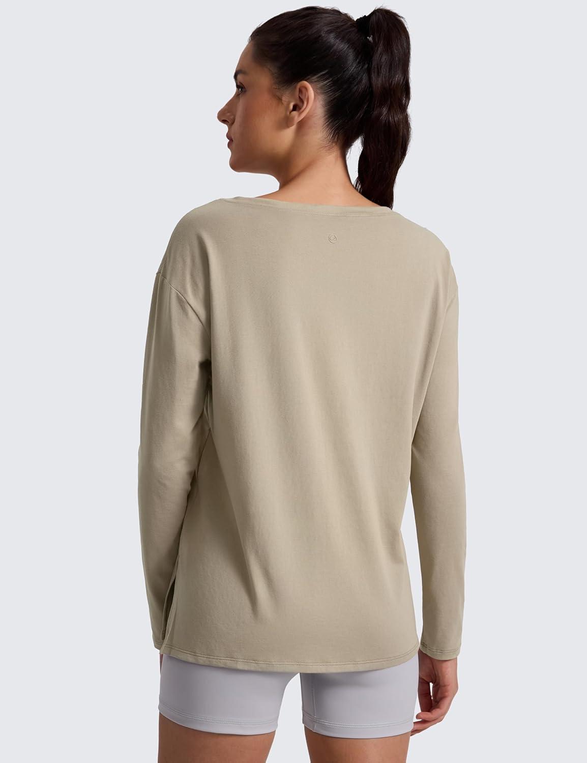 CRZ YOGA Cotton-Blend Long Sleeve Workout Tops for Women Boat Neck Soft Athletic Shirts Casual Going Out Fall T-Shirts(Oak)