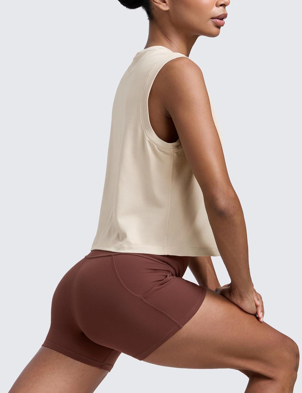 CRZ YOGA Cotton-Blend Workout Muscle Tank for Women Breathable Quick Dry High Neck Athletic Tops Casual Sleeveless Shirts(Mojave Tan)
