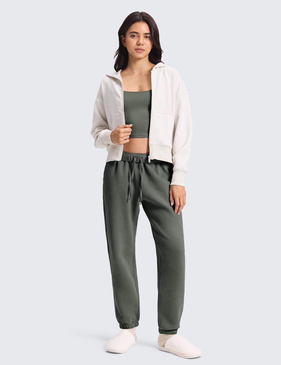 CRZ YOGA Cotton Fleece Lined Jogger Sweatpants Women 28″ – Casual Lounge Travel Pants with Pockets Winter Warm(Grey Sage)