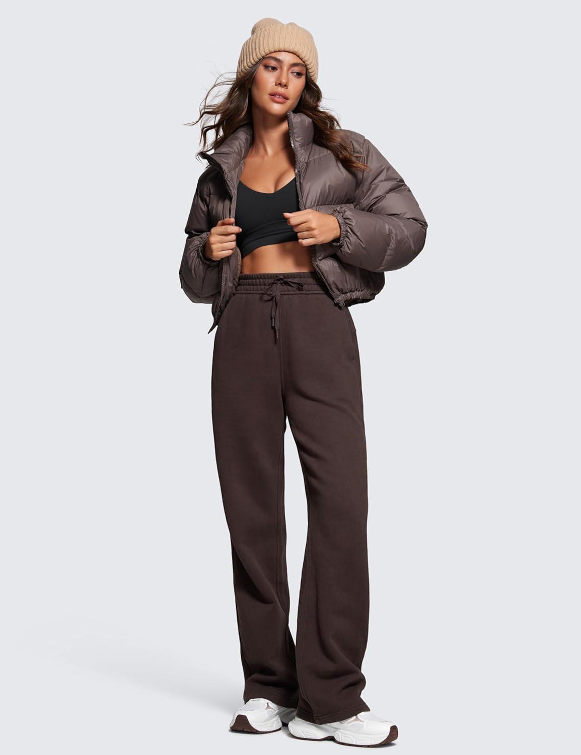 CRZ YOGA Cotton Fleece Lined Sweatpants Women 28″/30″/32″ – Straight Leg Casual Lounge Pants with Pockets Winter Warm(Hot Fudge Brown)