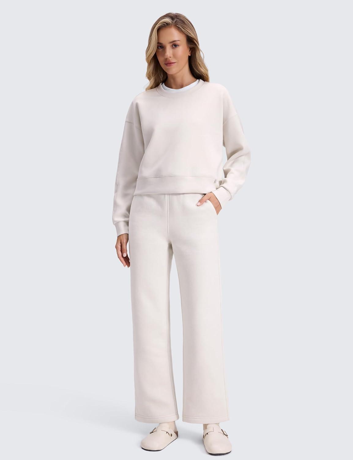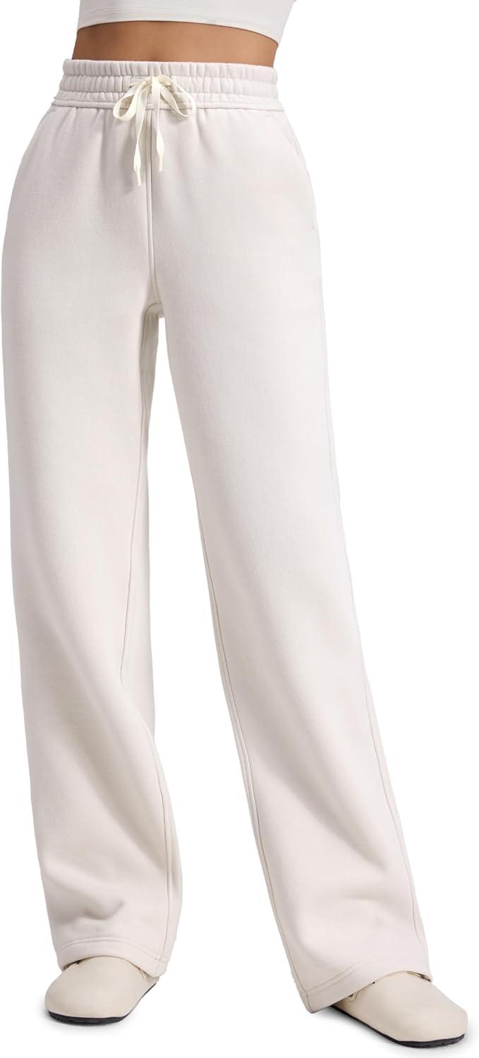 CRZ YOGA Cotton Fleece Lined Sweatpants Women 28″/30″/32″ – Straight Leg Casual Lounge Pants with Pockets Winter Warm(Milky White (Bone))