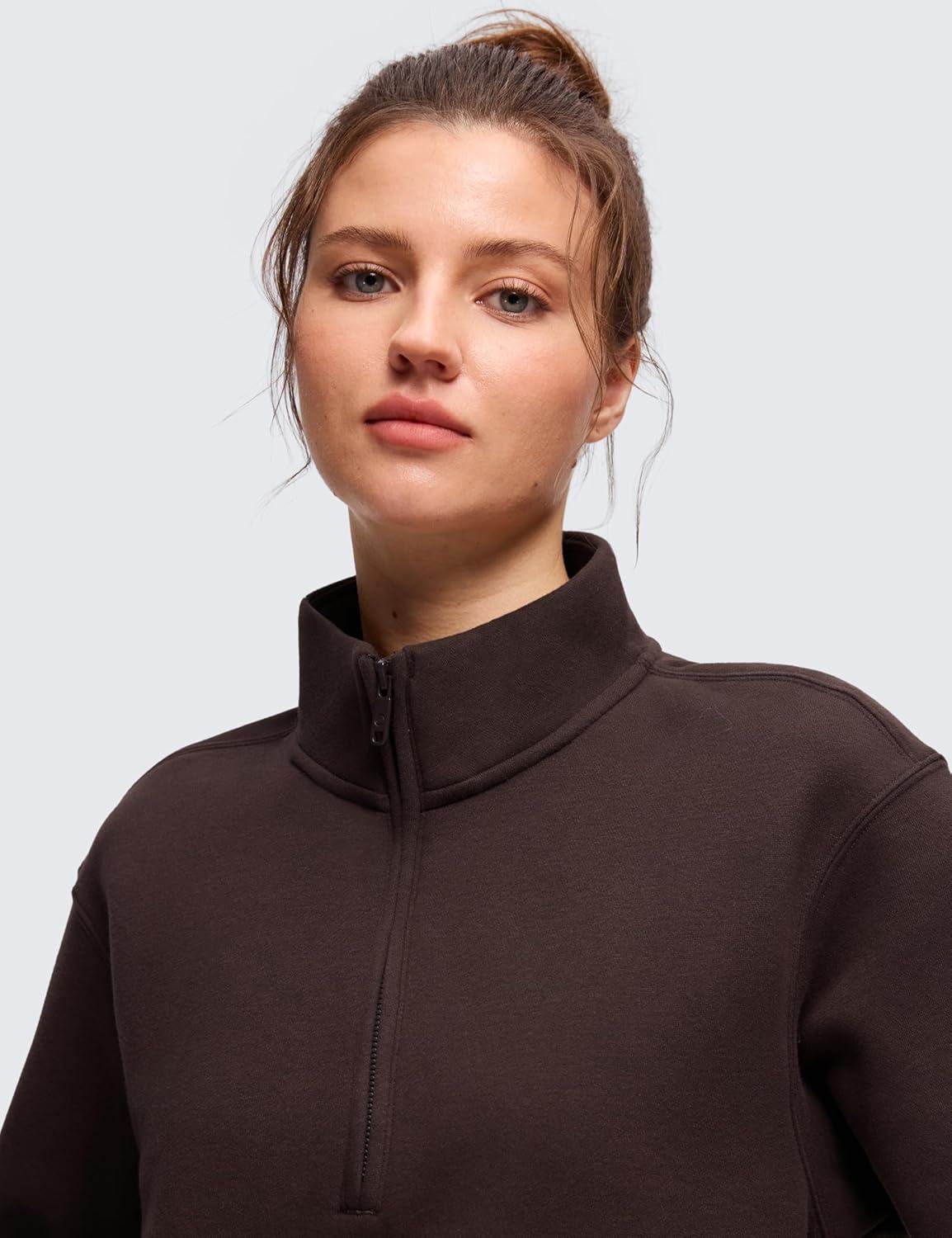 CRZ YOGA women's sweatshirts are refined with high-quality cotton blended fabrics and fleece lining, keeping you warm and comfortable in cold winter. With a cozy funnel neck design, this half zip sweatshirts provide enough warmth and a stylish look. Designed for daily outfit or lounging.