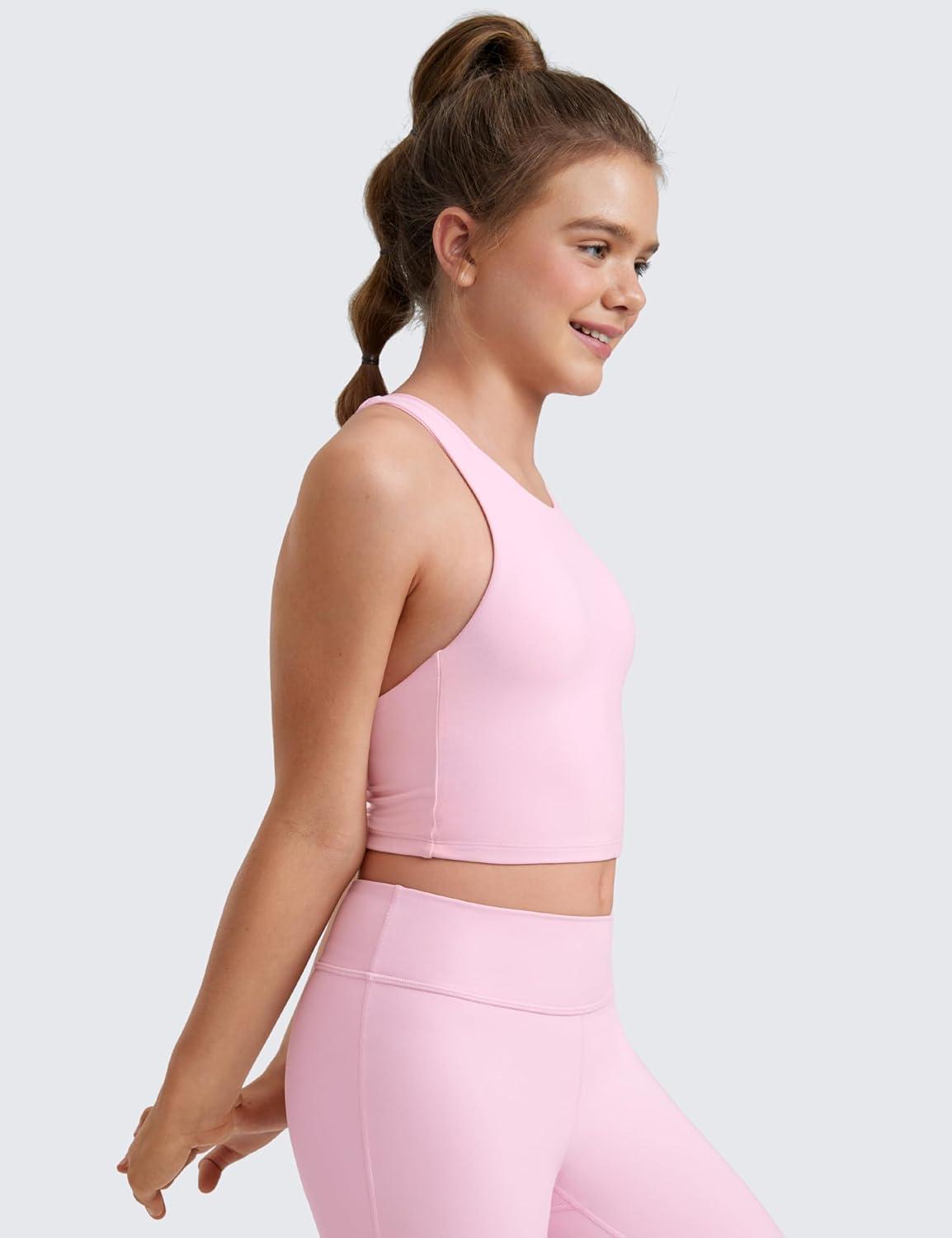CRZ YOGA Girls Butterluxe Double Lined Crop High Neck Tank Tops – Dance Yoga Athletic Casual Racerback Tight Kids Teen(Pink Peony)