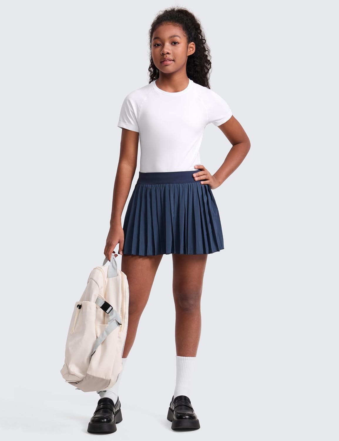 CRZ YOGA Girls Seamless Short Sleeve Athletic T Shirts – Active Sports Casual Tees Crew Neck Kids Teen(True Navy)