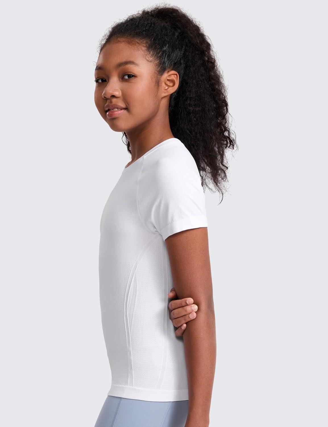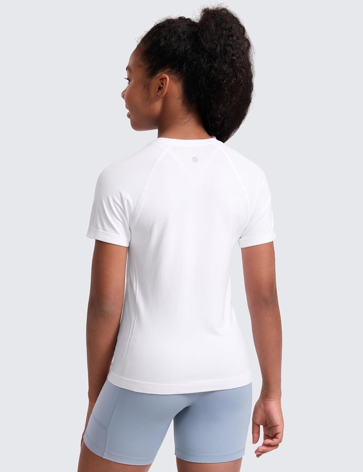 CRZ YOGA Girls Seamless Short Sleeve Athletic T Shirts – Active Sports Casual Tees Crew Neck Kids Teen(White)