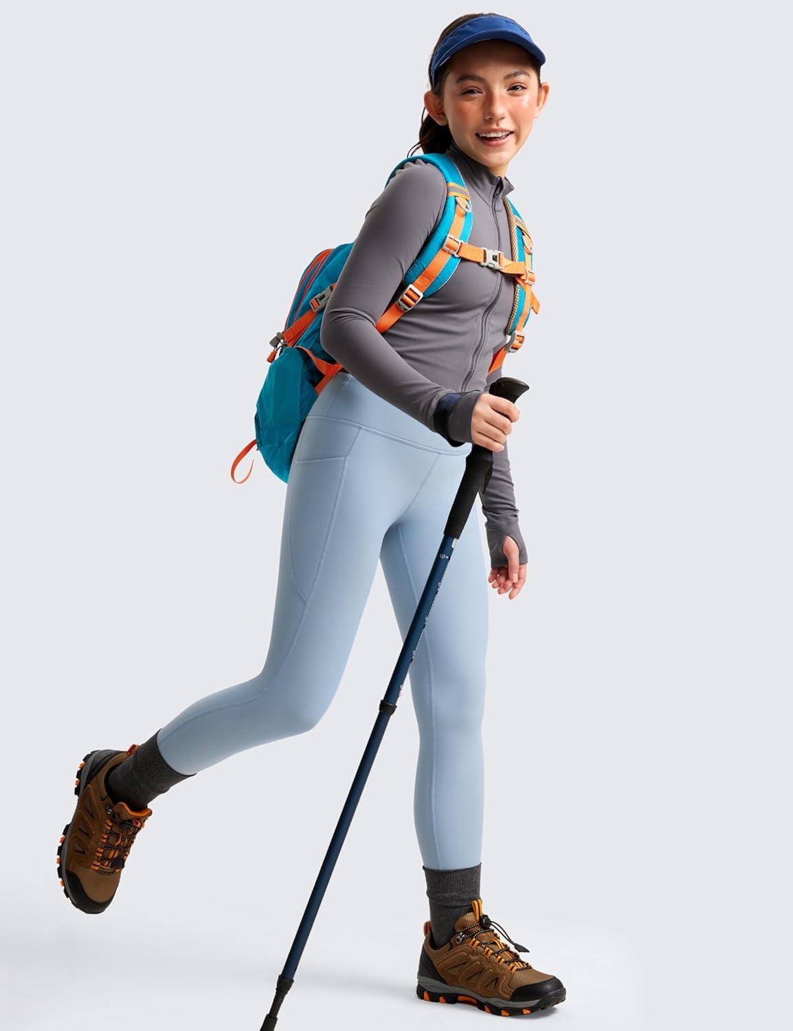 CRZ YOGA Girls Thermal Fleece Lined Athletic Leggings Water Resistant High Waist Warm Winter Kids Lounge Pants Side Pockets(Cambric Blue)