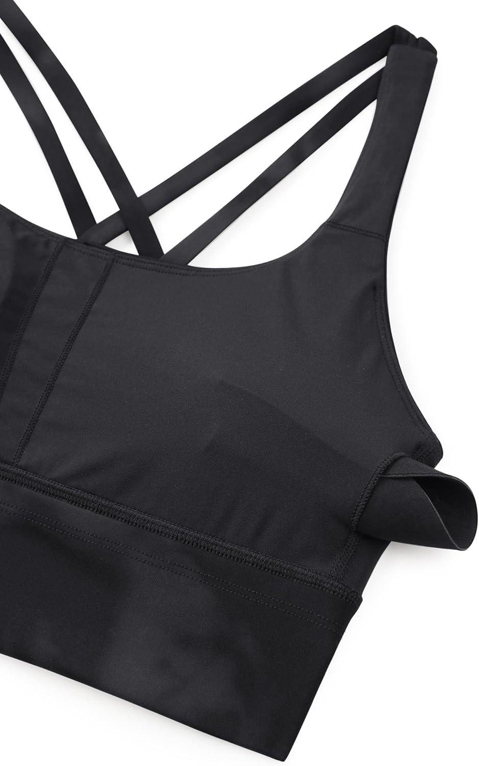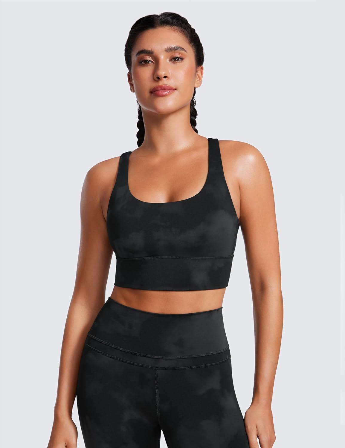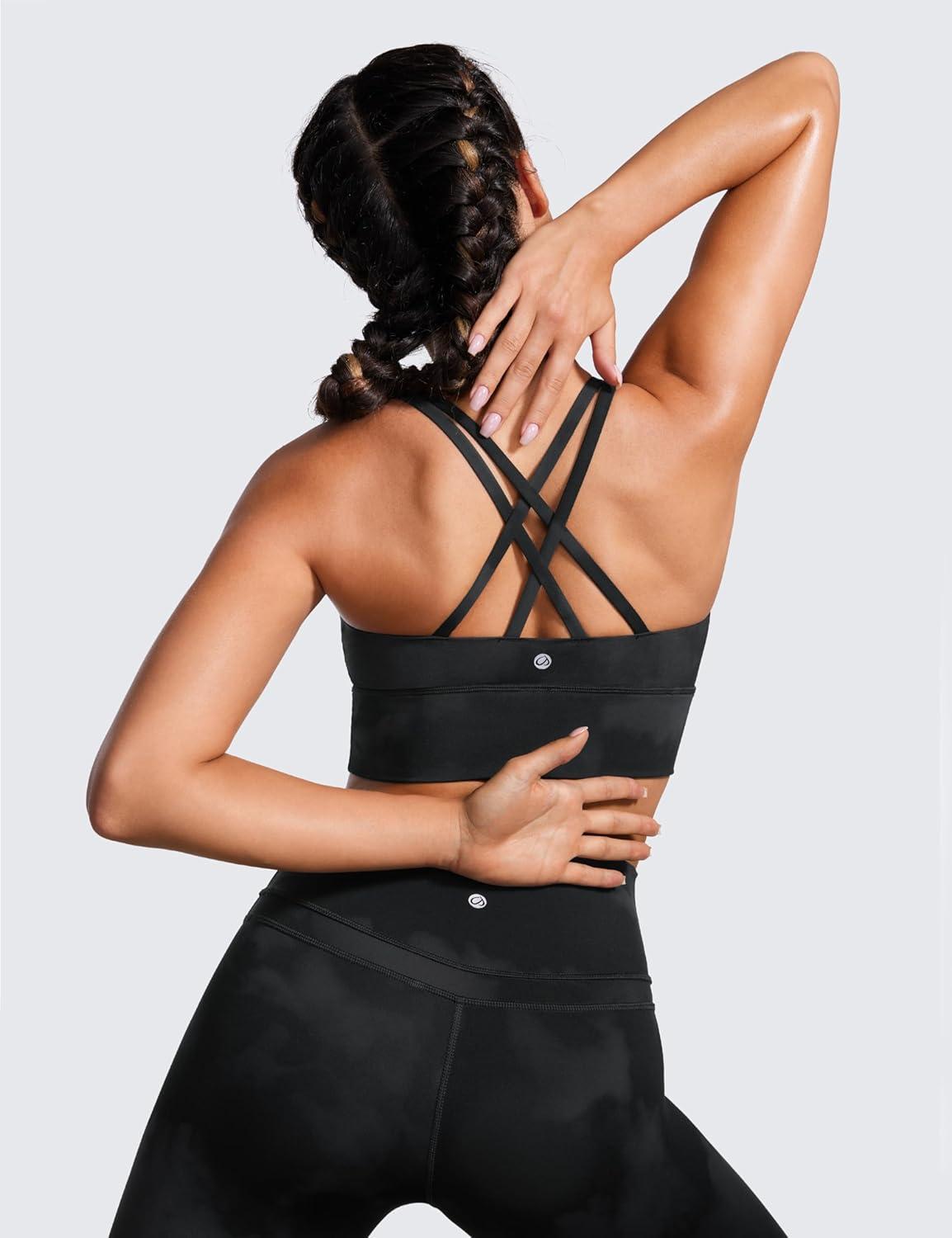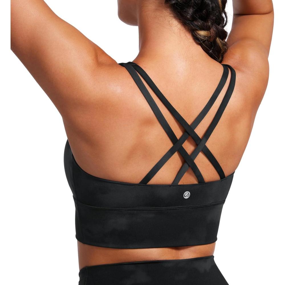 CRZ YOGA Naked Feeling Strappy Longline Sports Bras for Women – Medium Impact Criss Cross Yoga Padded Workout Crop Top(Black Tie Dye Flowers)