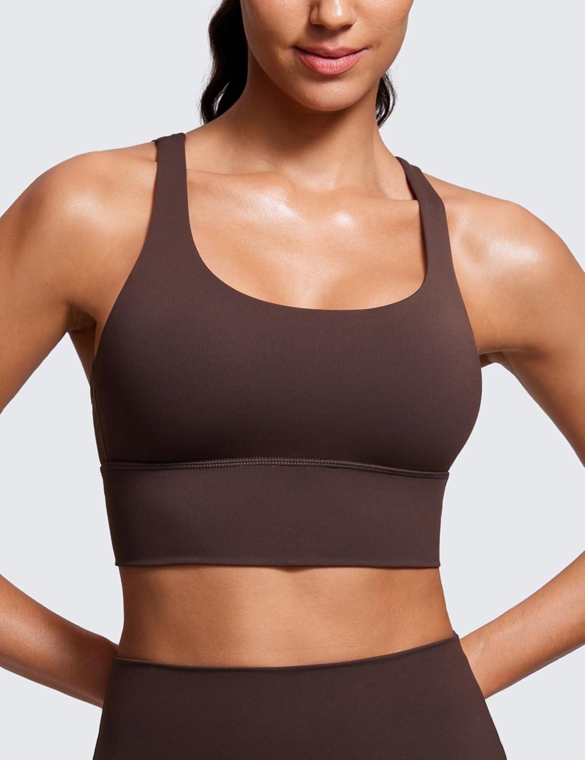 imageCRZ YOGA Naked Feeling Strappy Longline Sports Bras for Women  Medium Impact Criss Cross Yoga Padded Workout Crop TopHot Fudge Brown