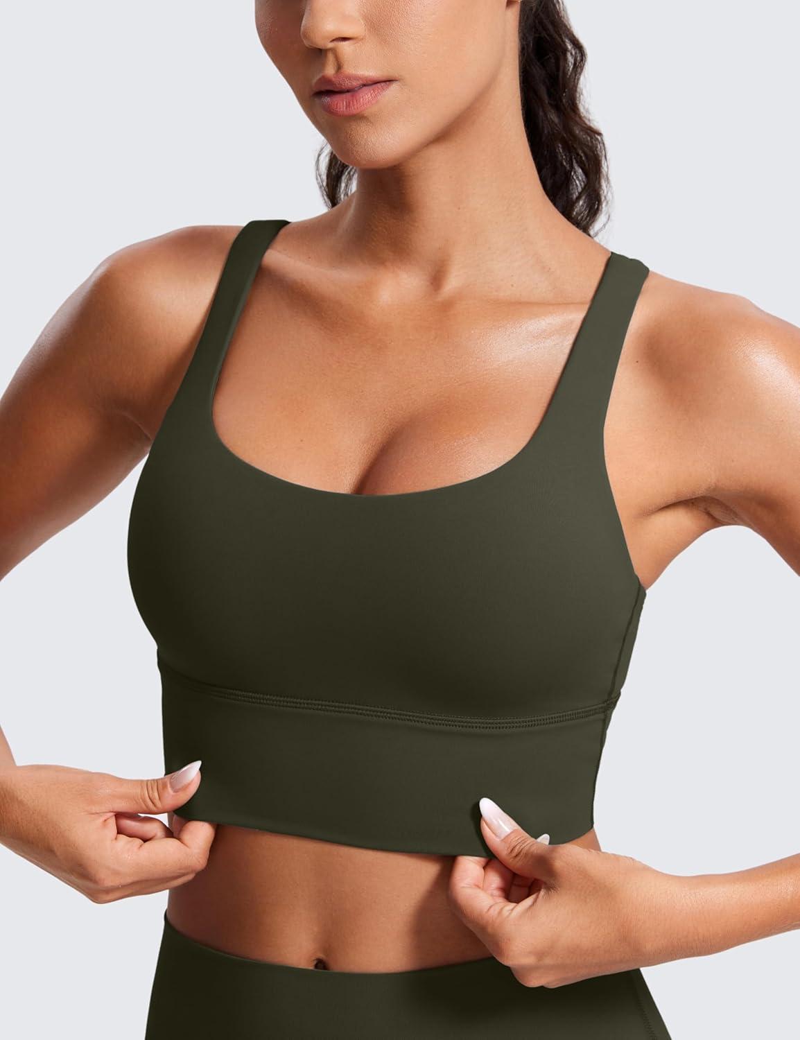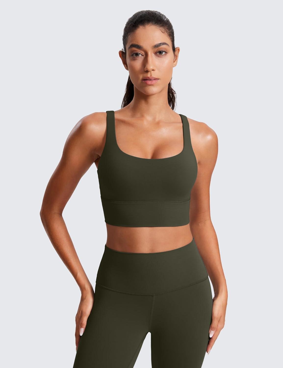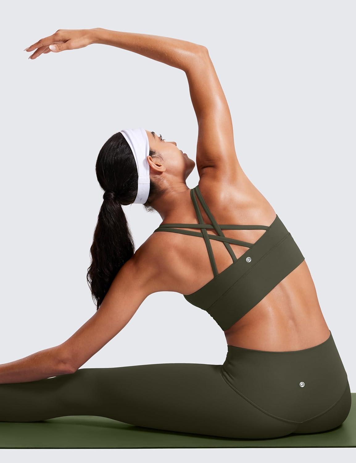 CRZ YOGA Naked Feeling Strappy Longline Sports Bras for Women – Medium Impact Criss Cross Yoga Padded Workout Crop Top(Olive Green)