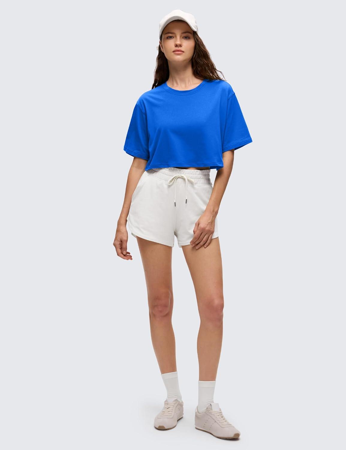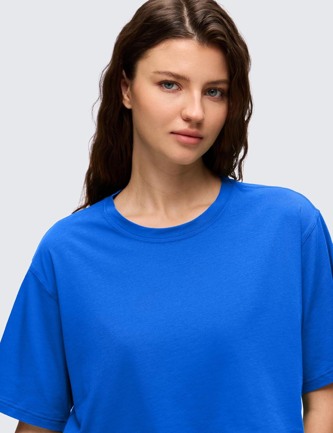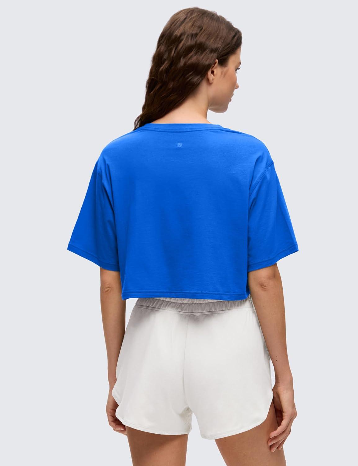 CRZ YOGA Pima Cotton Loose Crop T-Shirts for Women – Workout Yoga Casual Athletic Running Short Sleeve Shirts Crewneck Tops(Strong Blue)