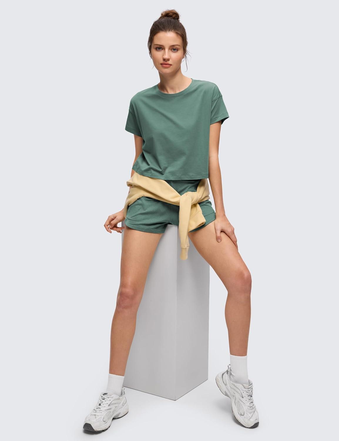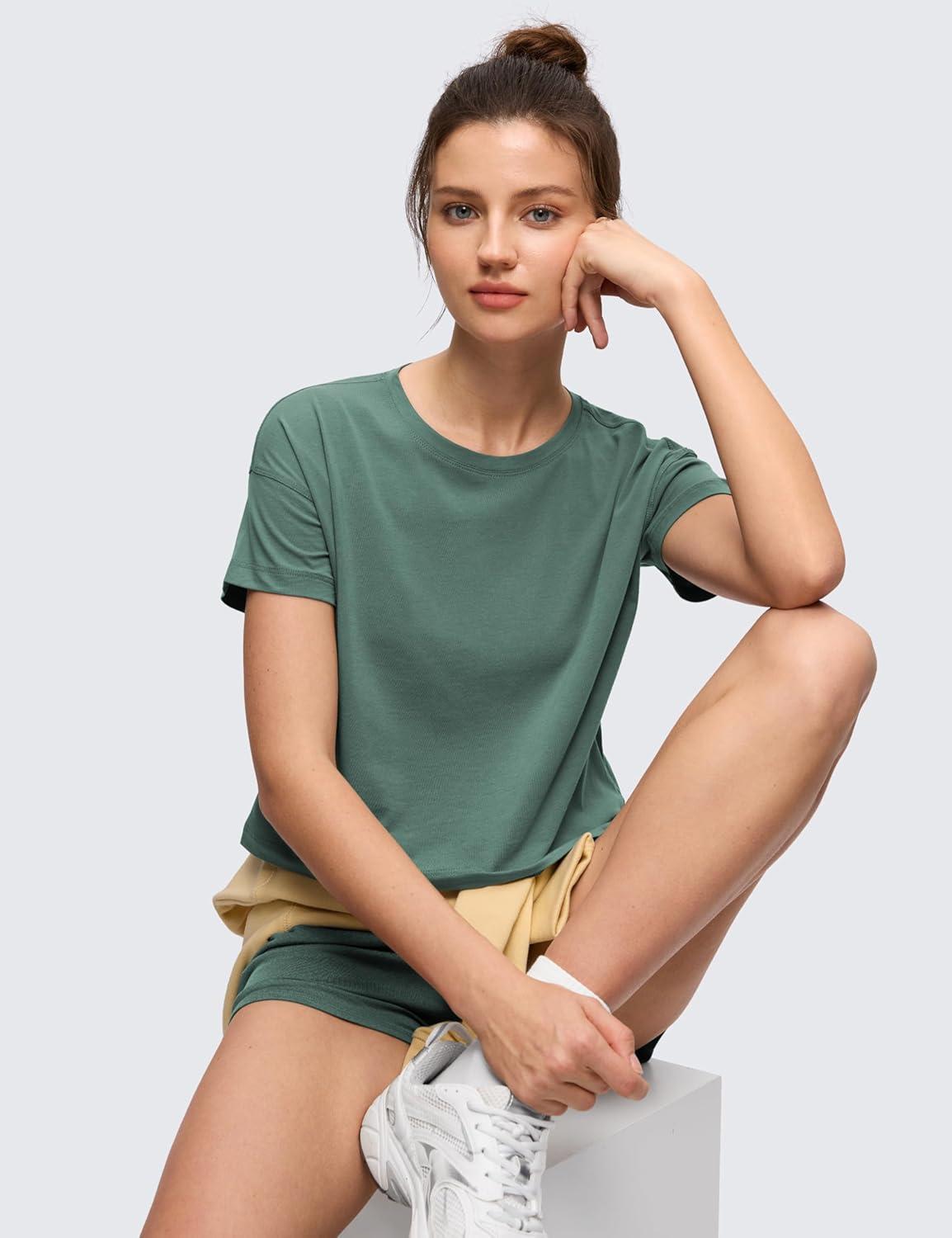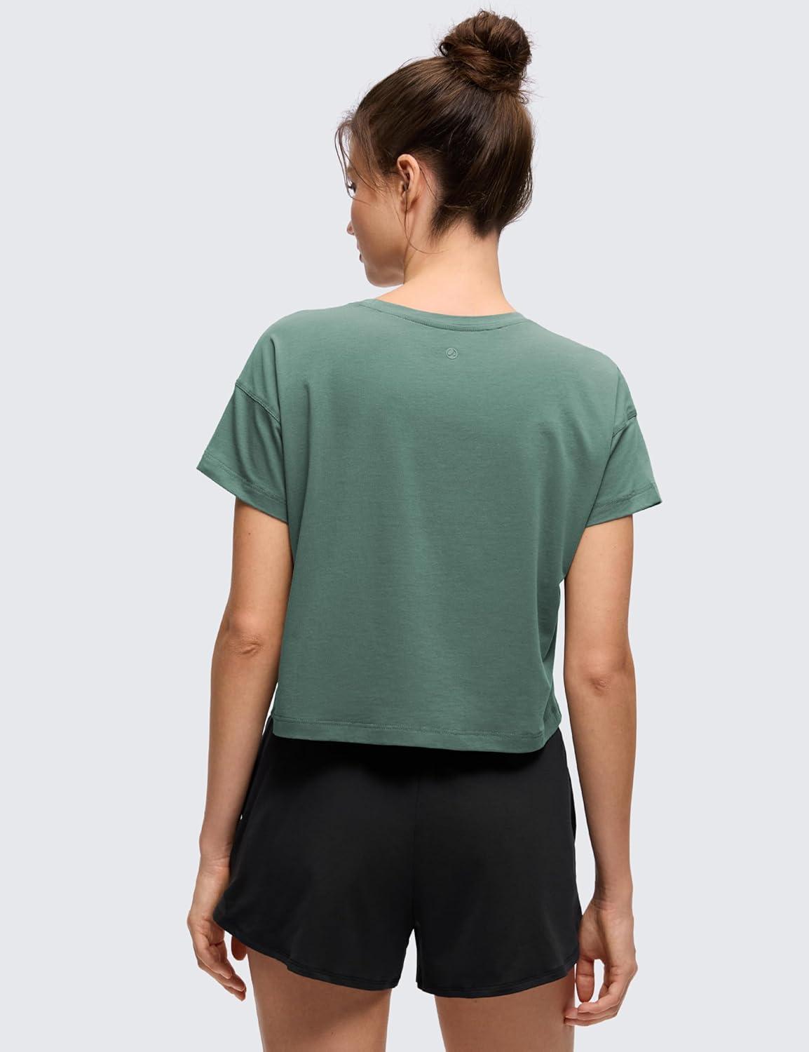 CRZ YOGA Pima Cotton Relaxed Crop T-Shirts for Women – Workout Athletic Gym Casual Short Sleeve Shirts Loose Crewneck Tops(Graphite Green)
