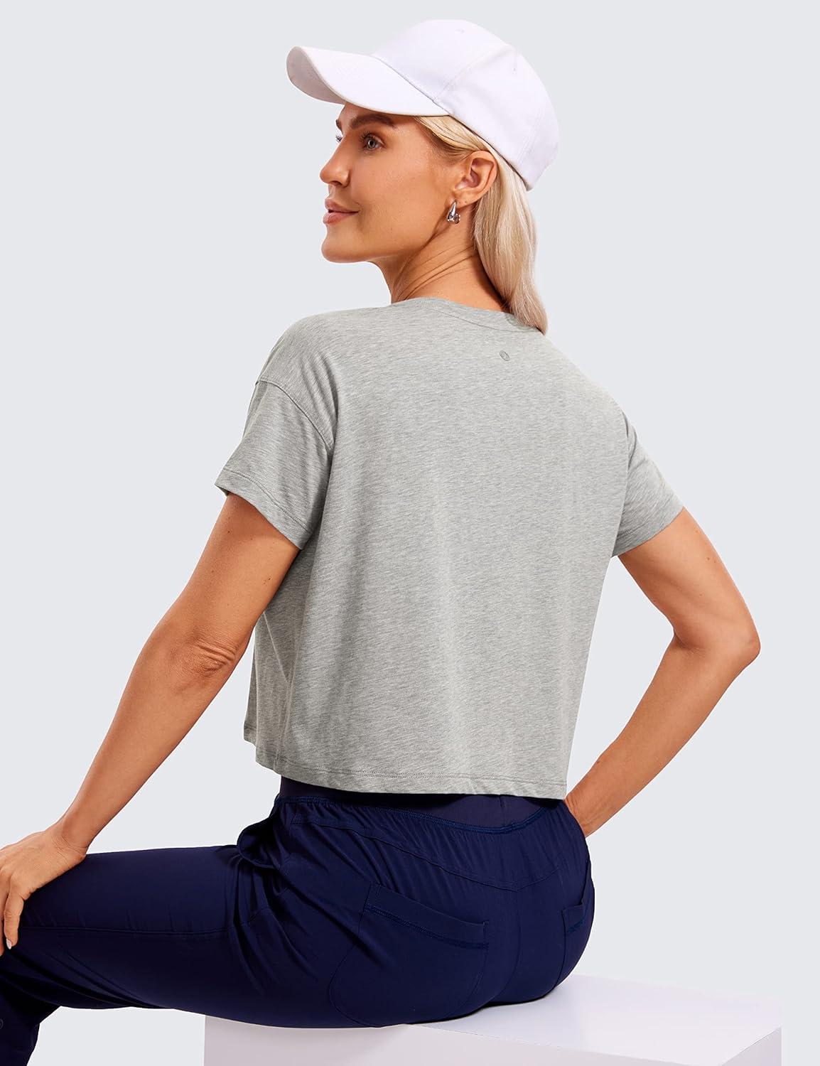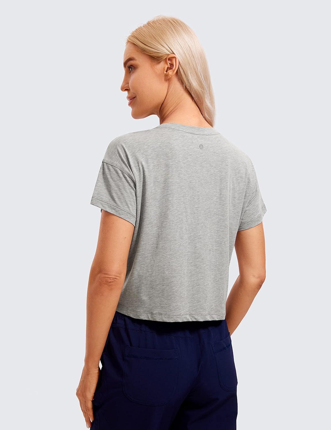 CRZ YOGA Pima Cotton Relaxed Crop T-Shirts for Women – Workout Athletic Gym Casual Short Sleeve Shirts Loose Crewneck Tops(Heathered Medium Grey)