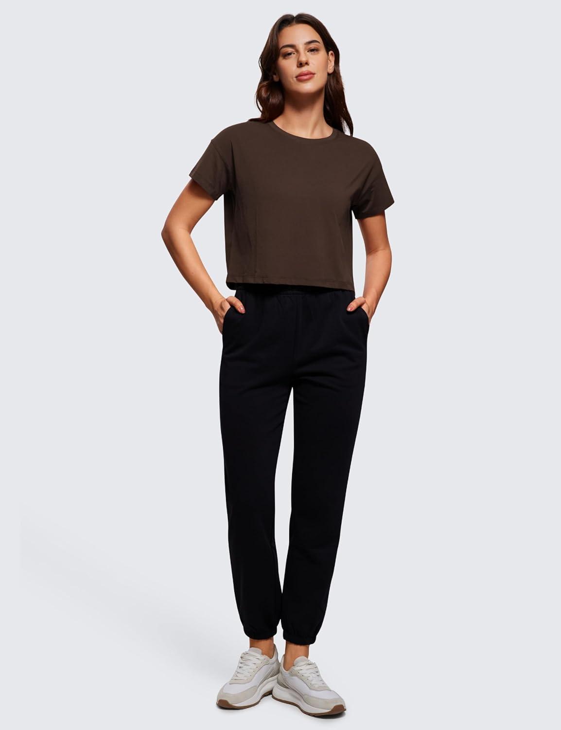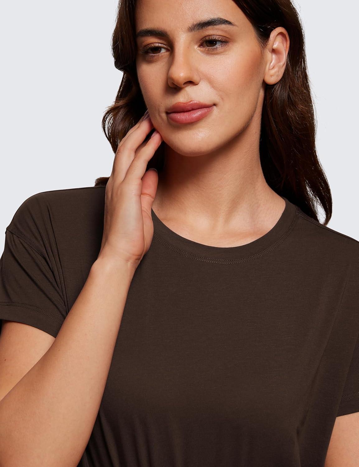 CRZ YOGA Pima Cotton Relaxed Crop T-Shirts for Women – Workout Athletic Gym Casual Short Sleeve Shirts Loose Crewneck Tops(Hot Fudge Brown)