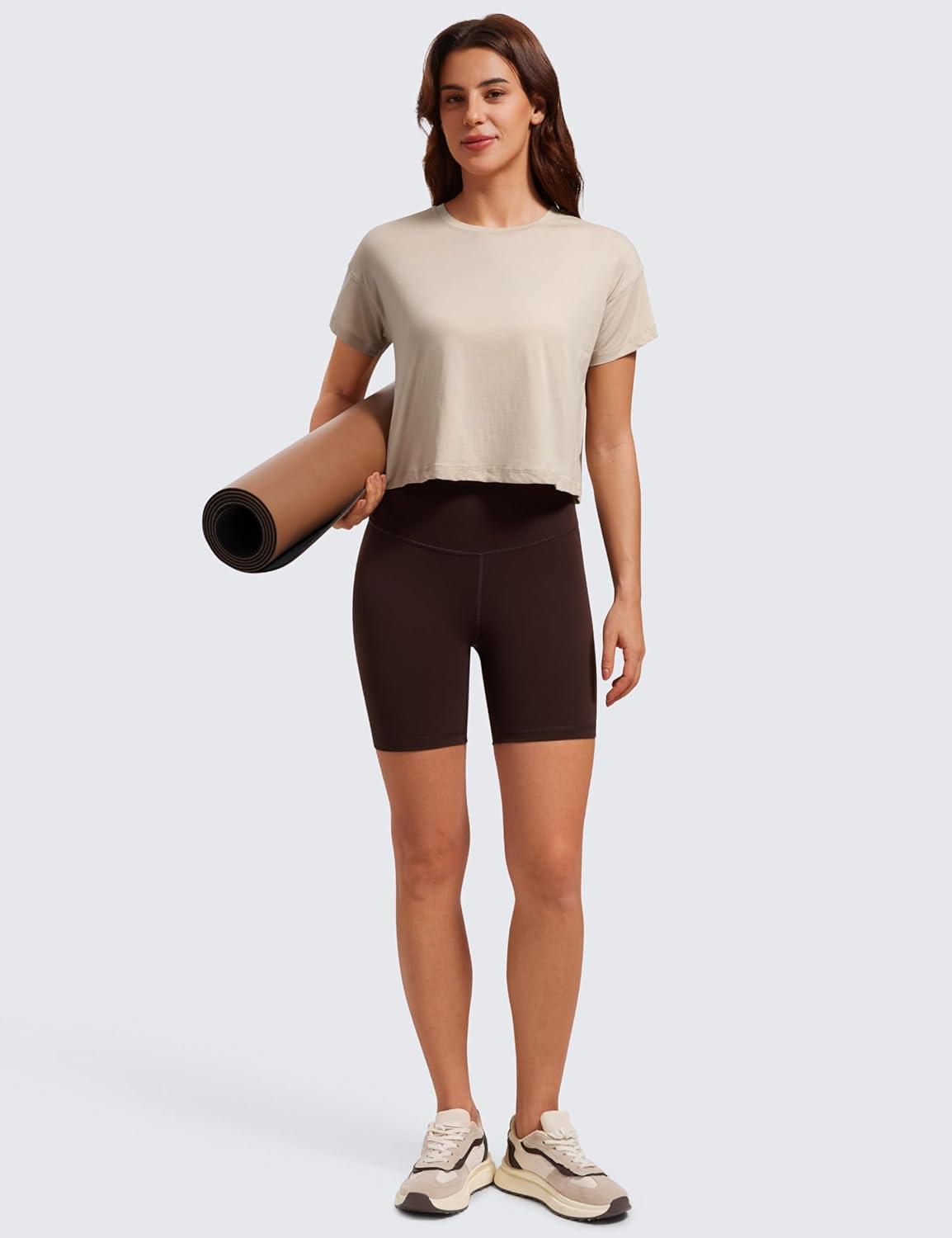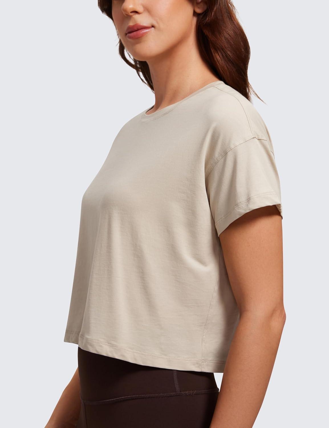 CRZ YOGA Pima Cotton Relaxed Crop T-Shirts for Women - Workout Athletic Gym Casual Short Sleeve Shirts Loose Crewneck Tops(Mojave Tan)