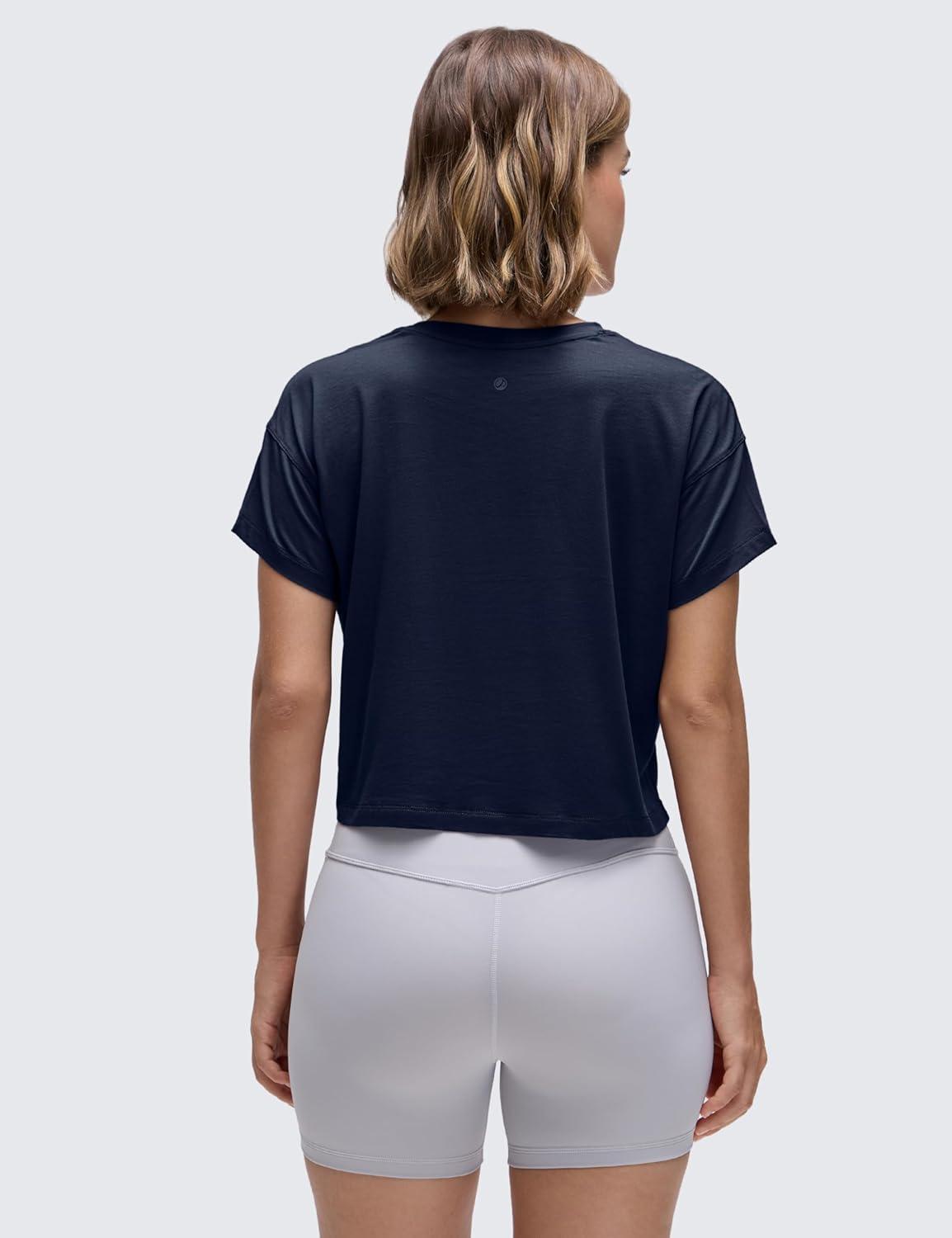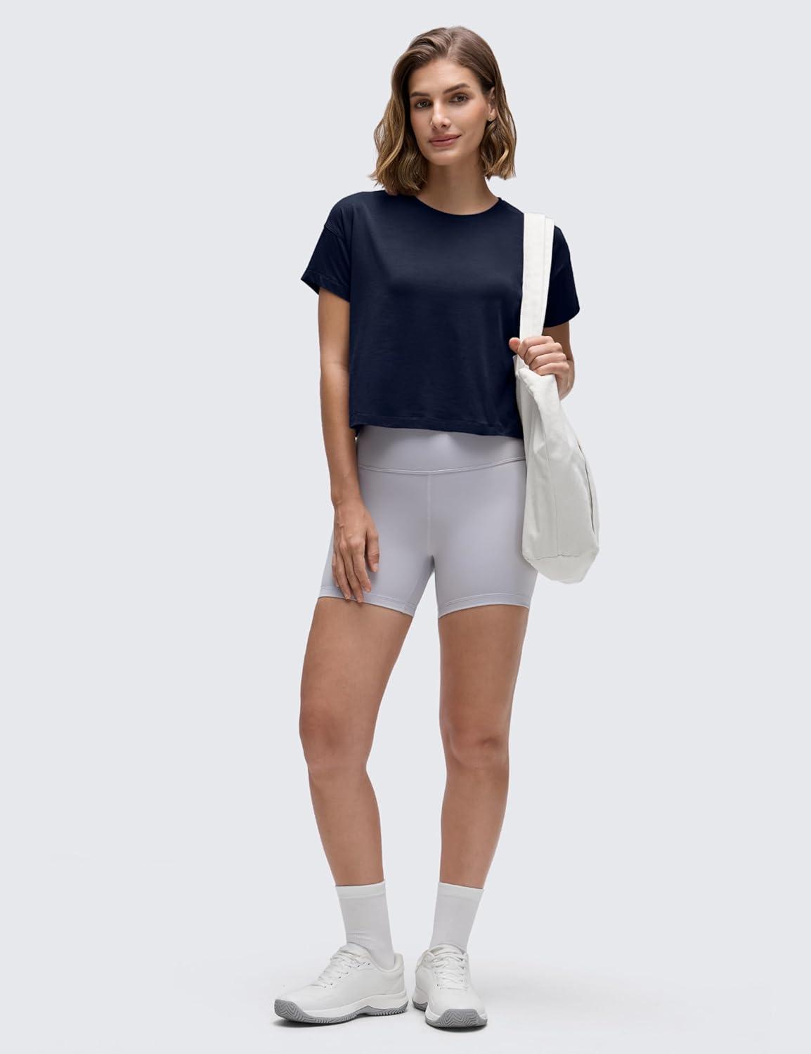 CRZ YOGA Pima Cotton Relaxed Crop T-Shirts for Women – Workout Athletic Gym Casual Short Sleeve Shirts Loose Crewneck Tops(Navy)