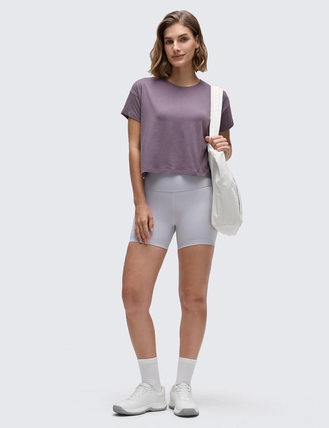 CRZ YOGA Pima Cotton Relaxed Crop T-Shirts for Women – Workout Athletic Gym Casual Short Sleeve Shirts Loose Crewneck Tops(Purple Gray)