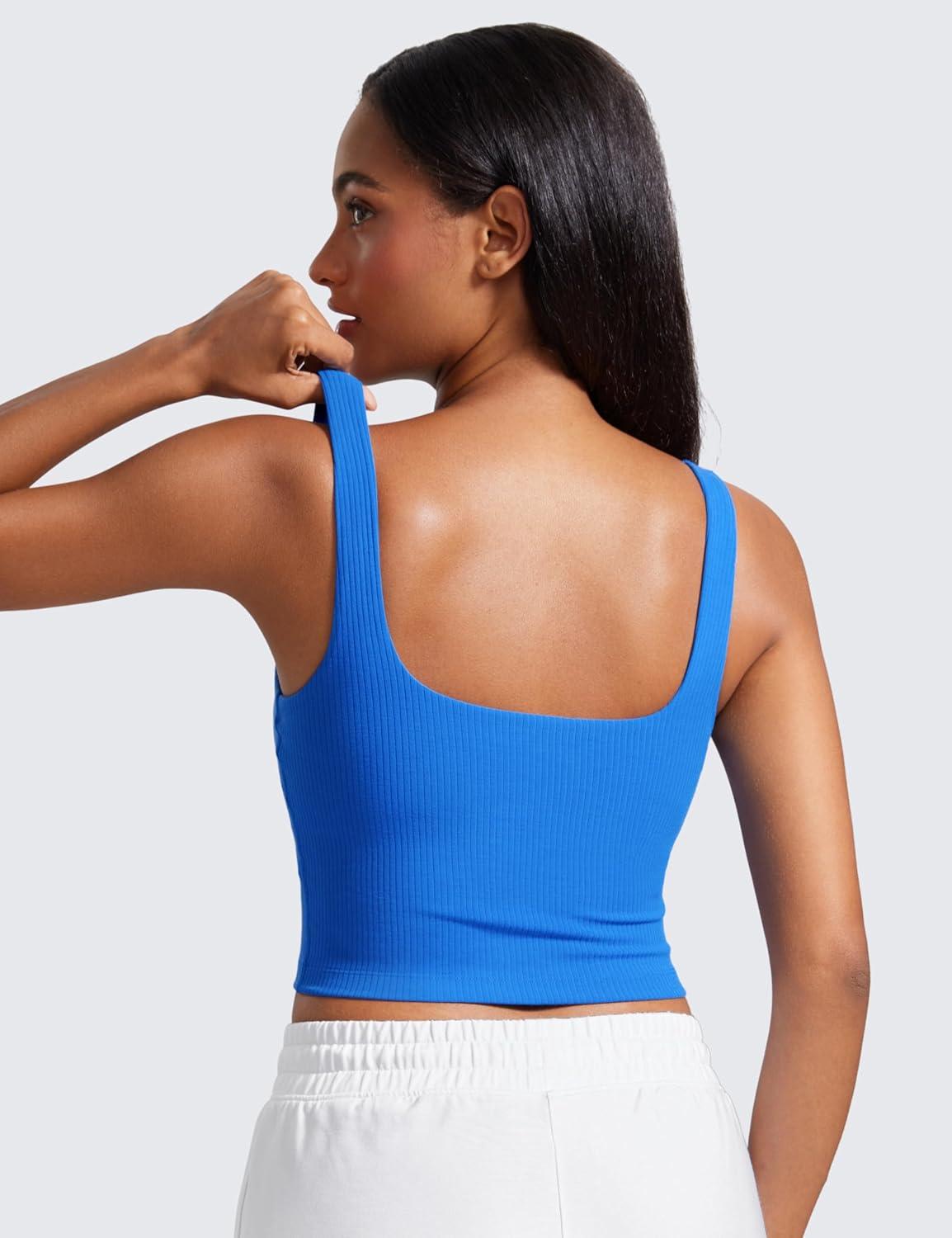 CRZ YOGA Ribbed Henley Crop Tank Tops for Women – Square Back Padded Yoga Workout Longline Sports Bras(Party Blue)