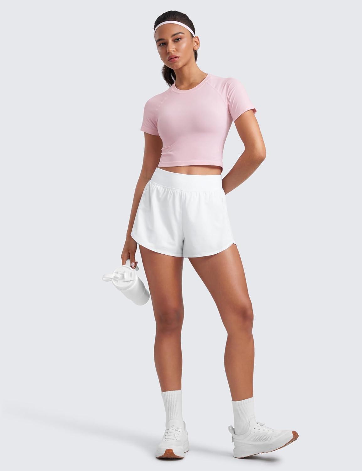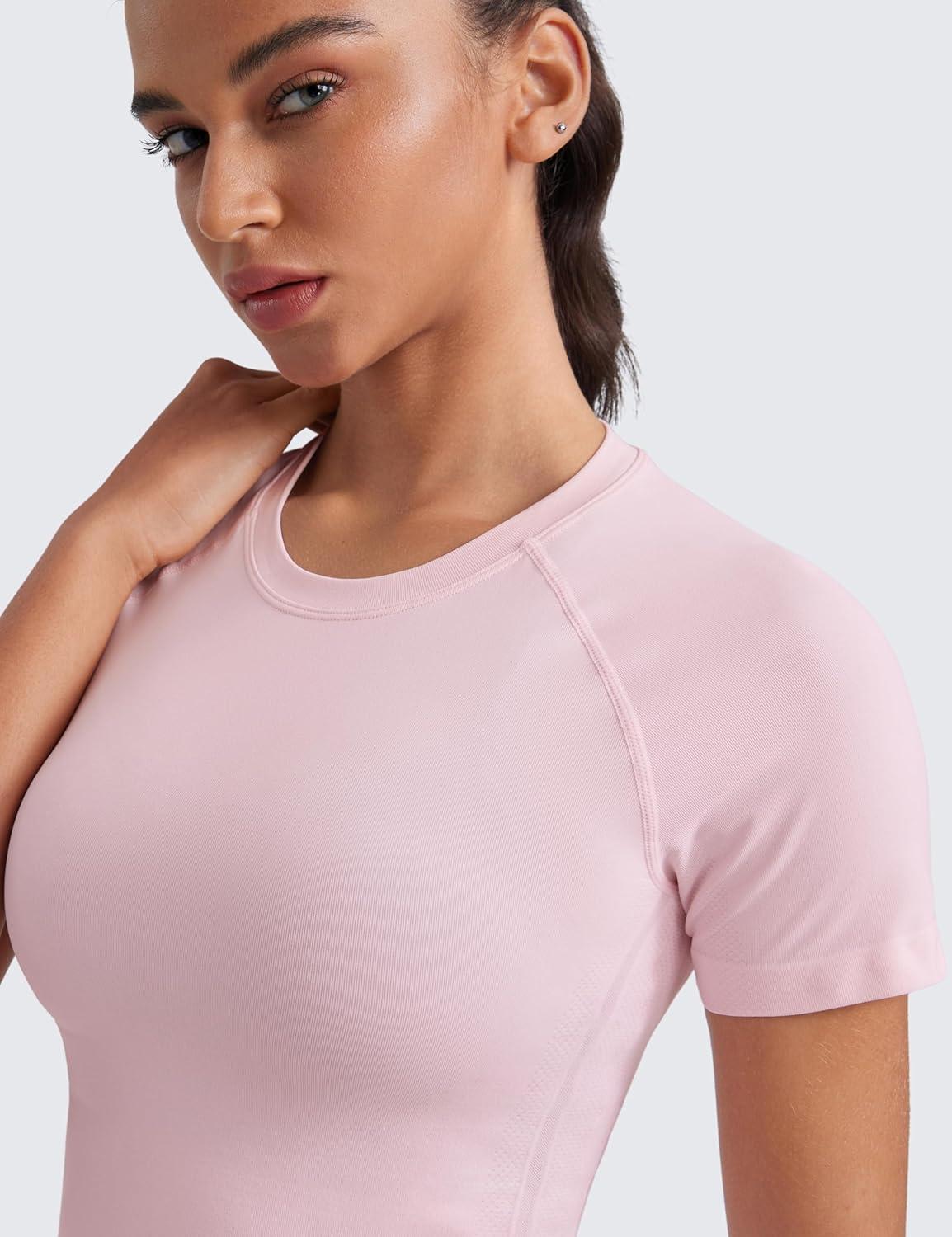 CRZ YOGA Seamless Crop Workout Tops for Women – Athletic Running Gym Yoga Short Sleeve Shirts Basic(Strawberry Pink)