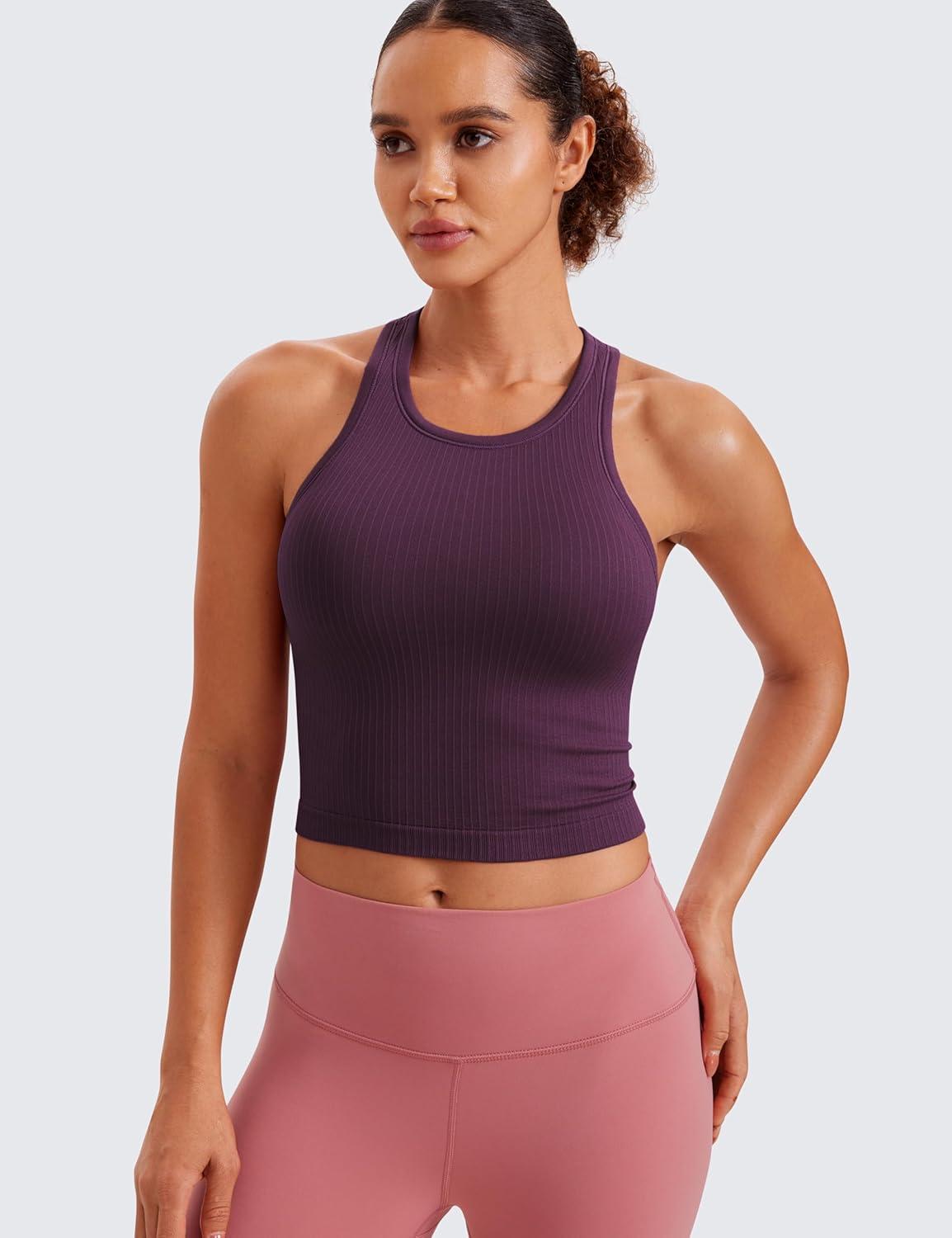 CRZ YOGA Seamless Ribbed High Neck Crop Tank Tops for Women – Longline Racerback Padded Sports Bras(Deep Purple)