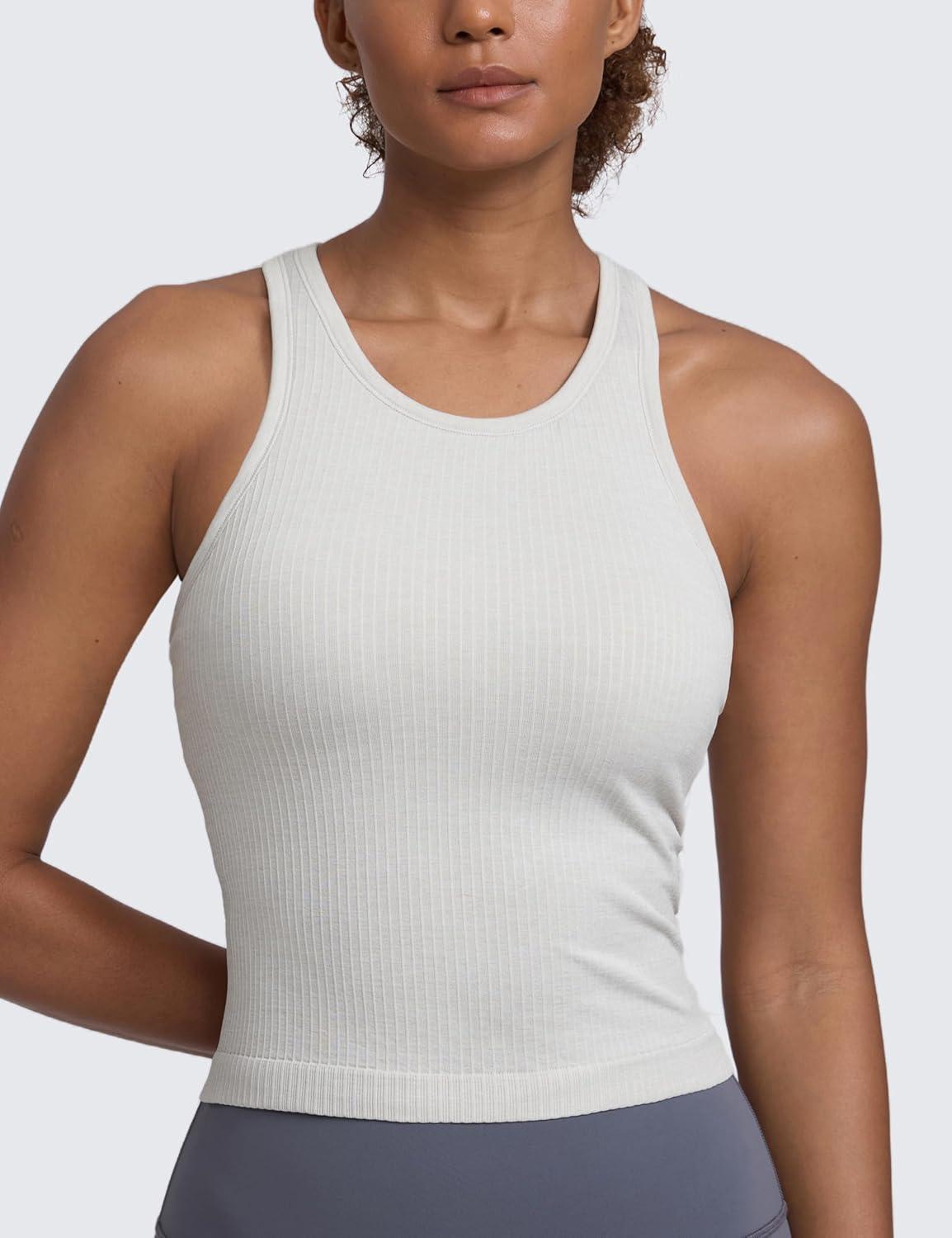 imageCRZ YOGA Seamless Ribbed High Neck Tank Top for Women  Sleeveless Crop Yoga Workout Shirt with Built in BraLight Grey