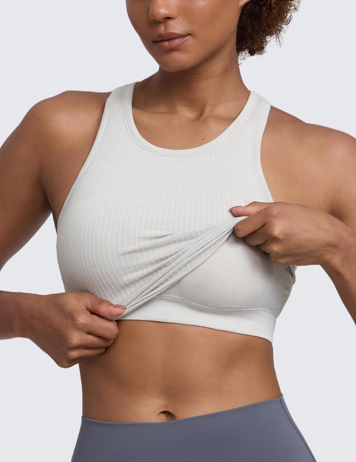 CRZ YOGA Seamless Ribbed High Neck Tank Top for Women – Sleeveless Crop Yoga Workout Shirt with Built in Bra(Light Grey)