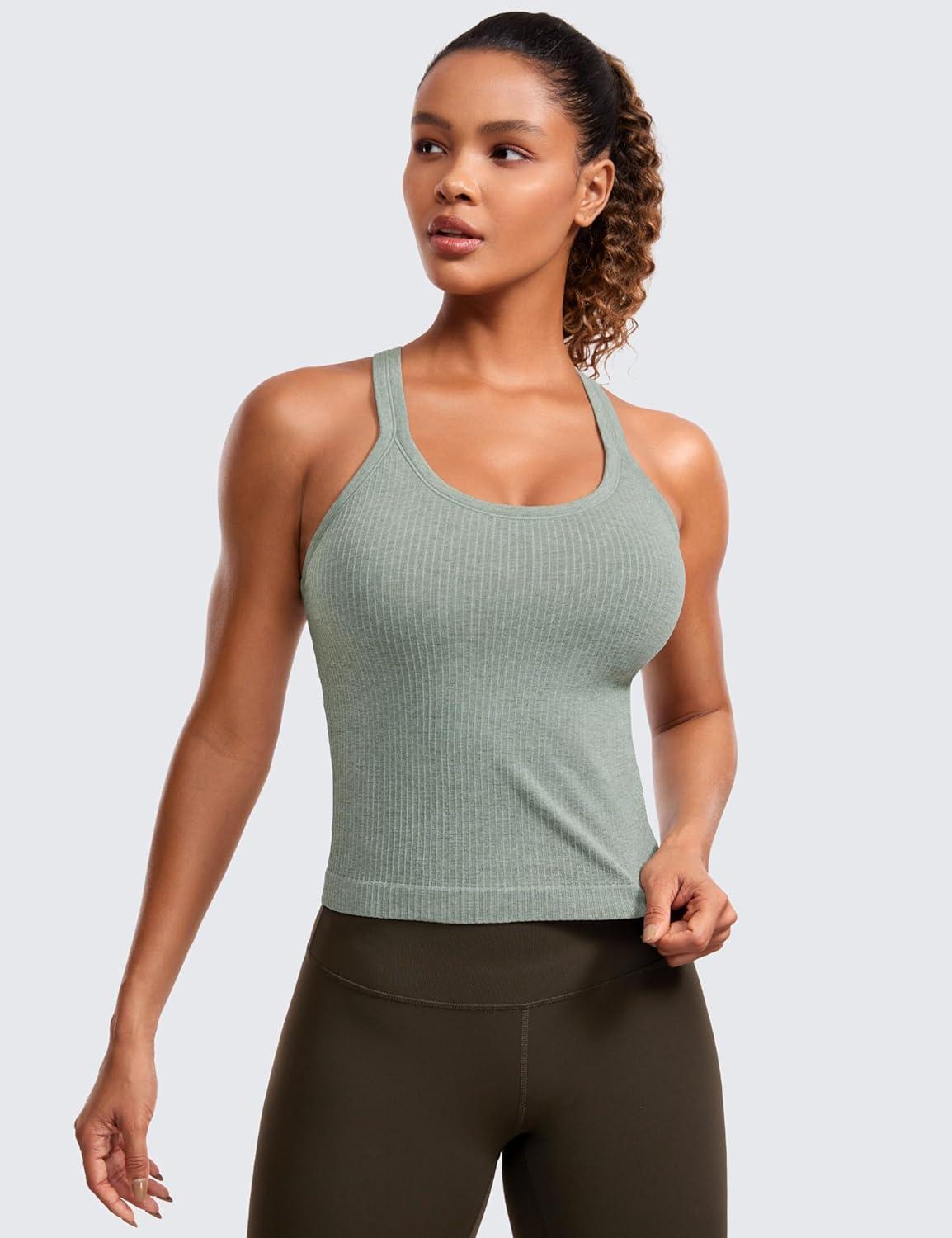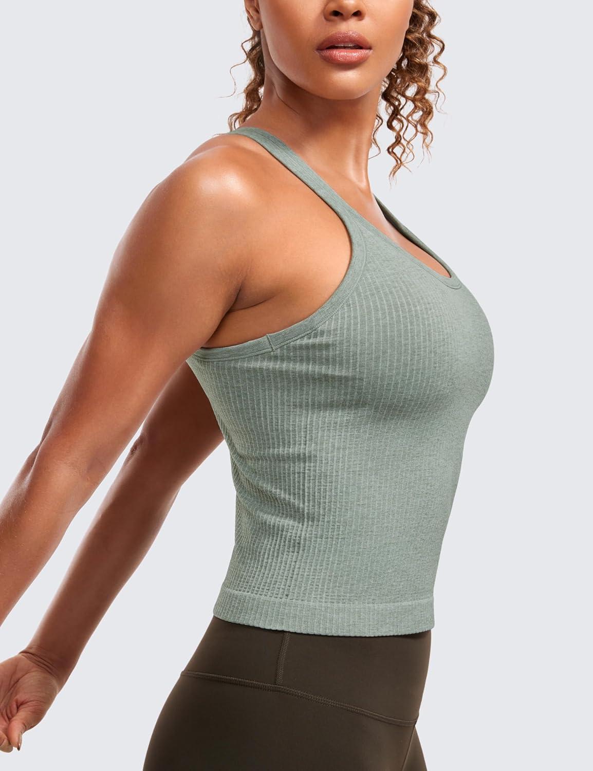 CRZ YOGA Seamless Ribbed Scoop Neck Tank Top for Women – Workout Racerback Padded Athletic Camisole with Built in Bra(Dark Green)