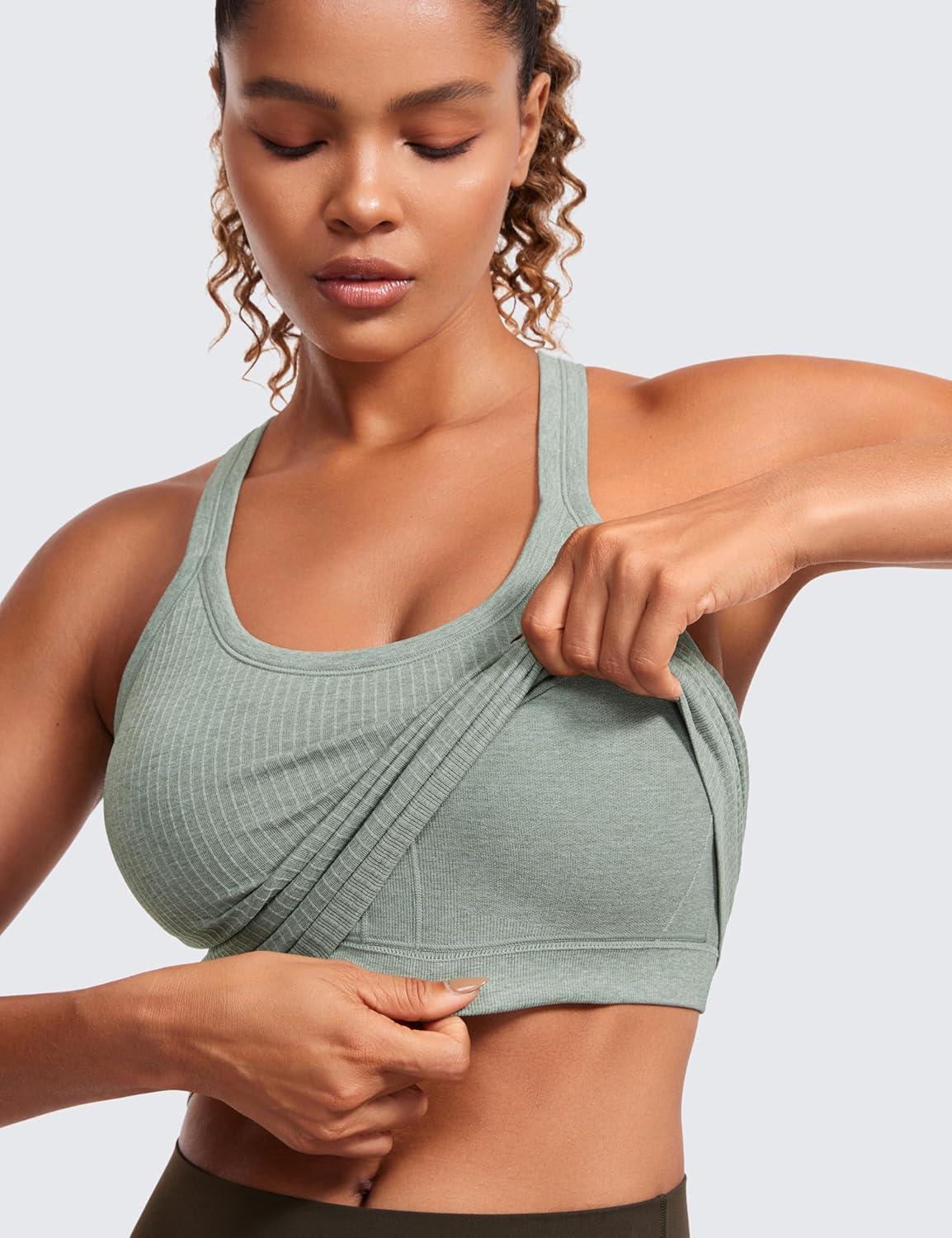 CRZ YOGA Seamless Ribbed Scoop Neck Tank Top for Women - Workout Racerback Padded Athletic Camisole with Built in Bra(Dark Green)