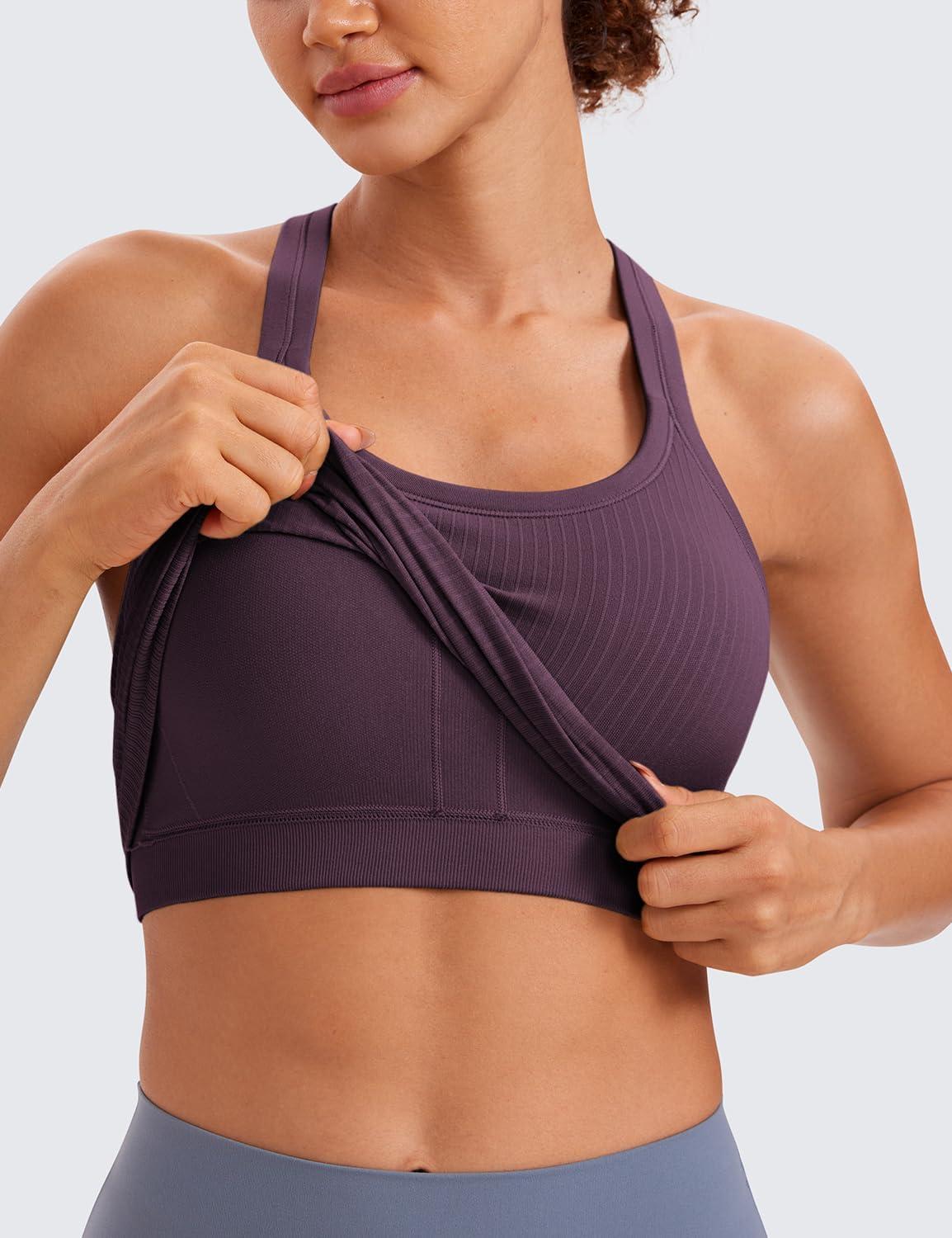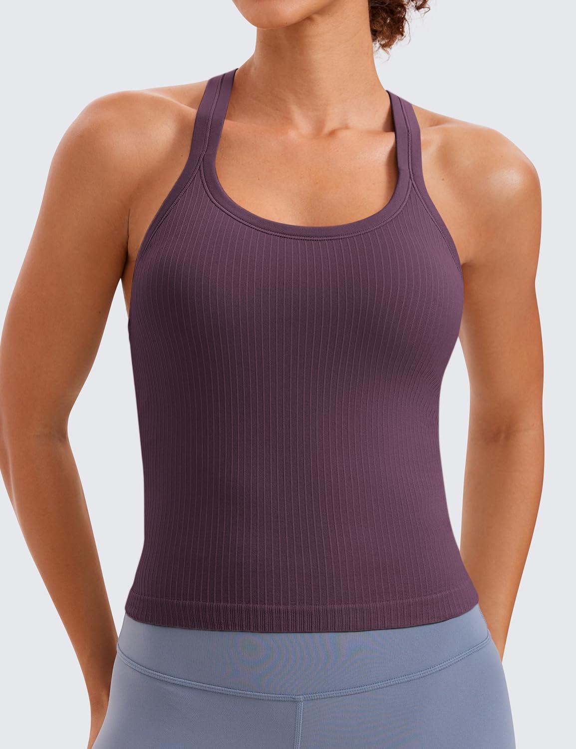 CRZ YOGA Seamless Ribbed Scoop Neck Tank Top for Women - Workout Racerback Padded Athletic Camisole with Built in Bra(Grape Thistle Purple)