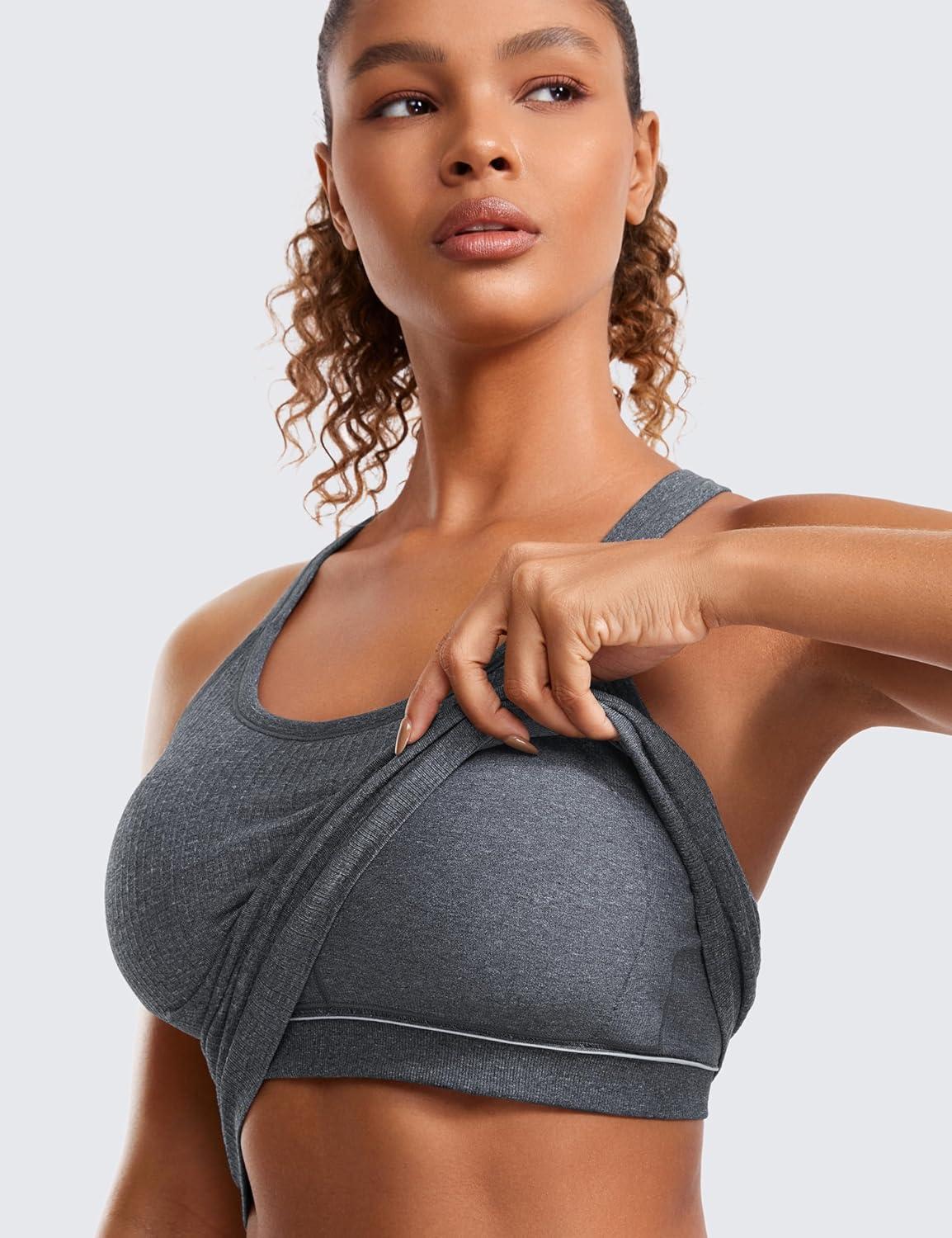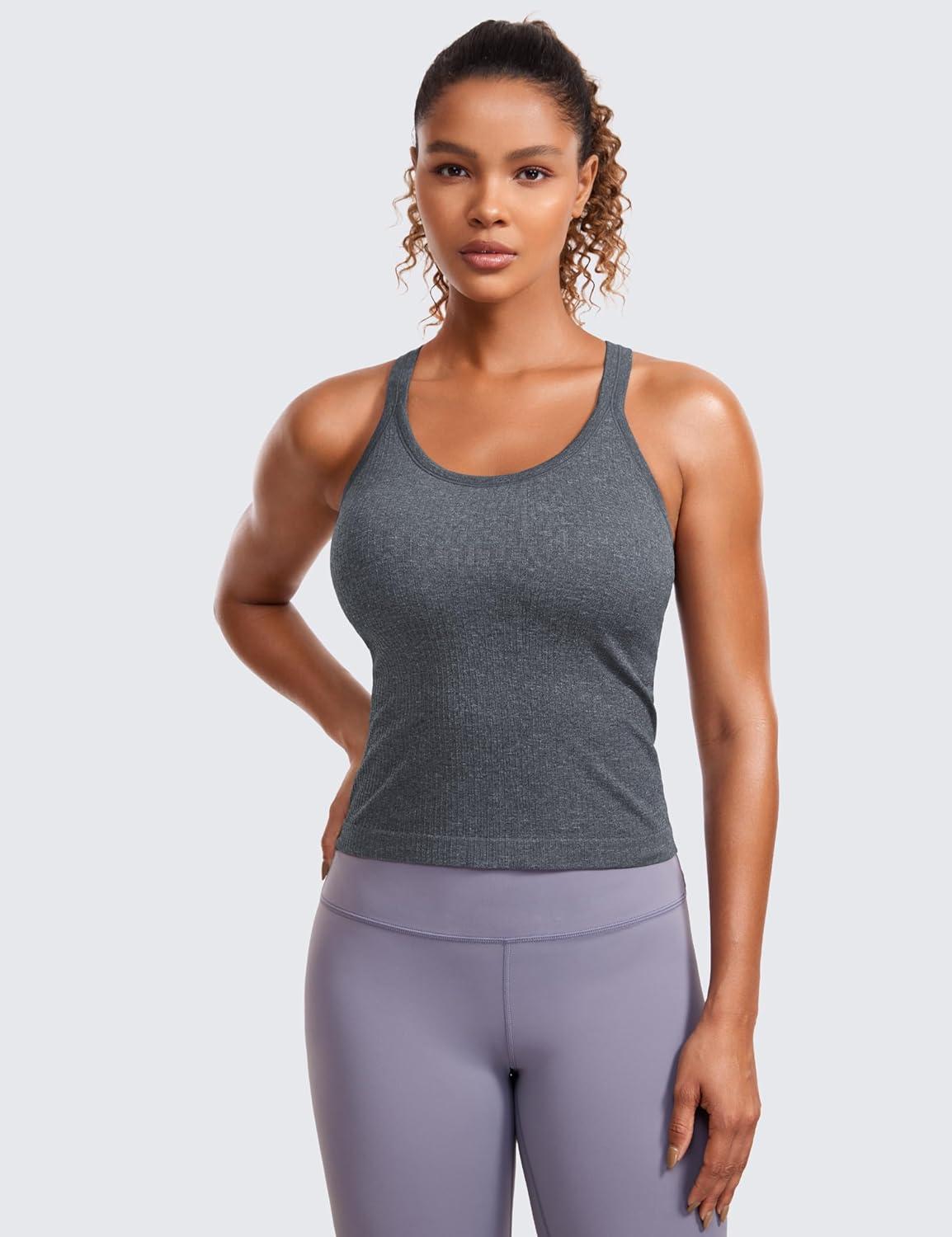 CRZ YOGA Seamless Ribbed Scoop Neck Tank Top for Women - Workout Racerback Padded Athletic Camisole with Built in Bra(Light Gray 7)