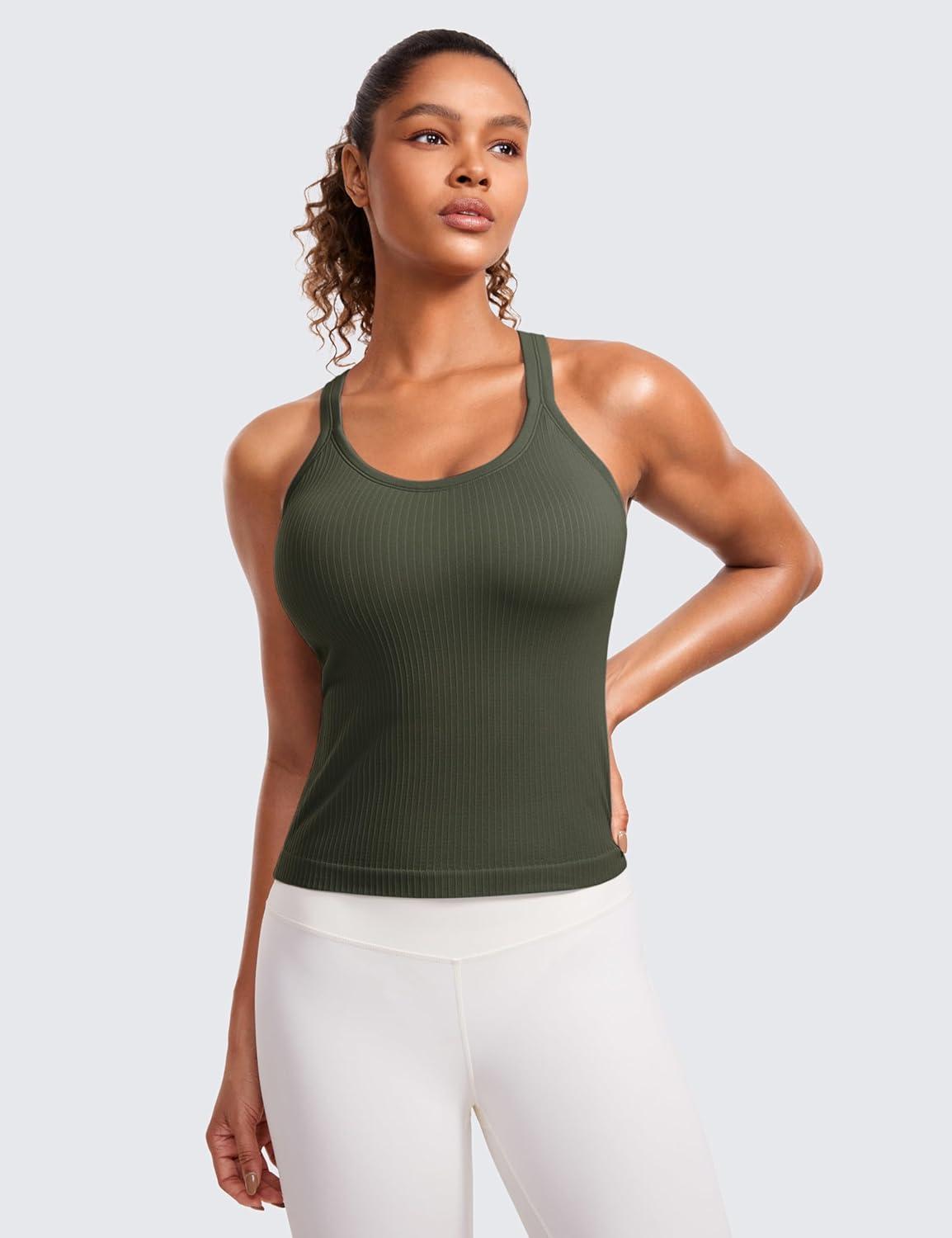 CRZ YOGA Seamless Ribbed Scoop Neck Tank Top for Women - Workout Racerback Padded Athletic Camisole with Built in Bra(Olive Green)