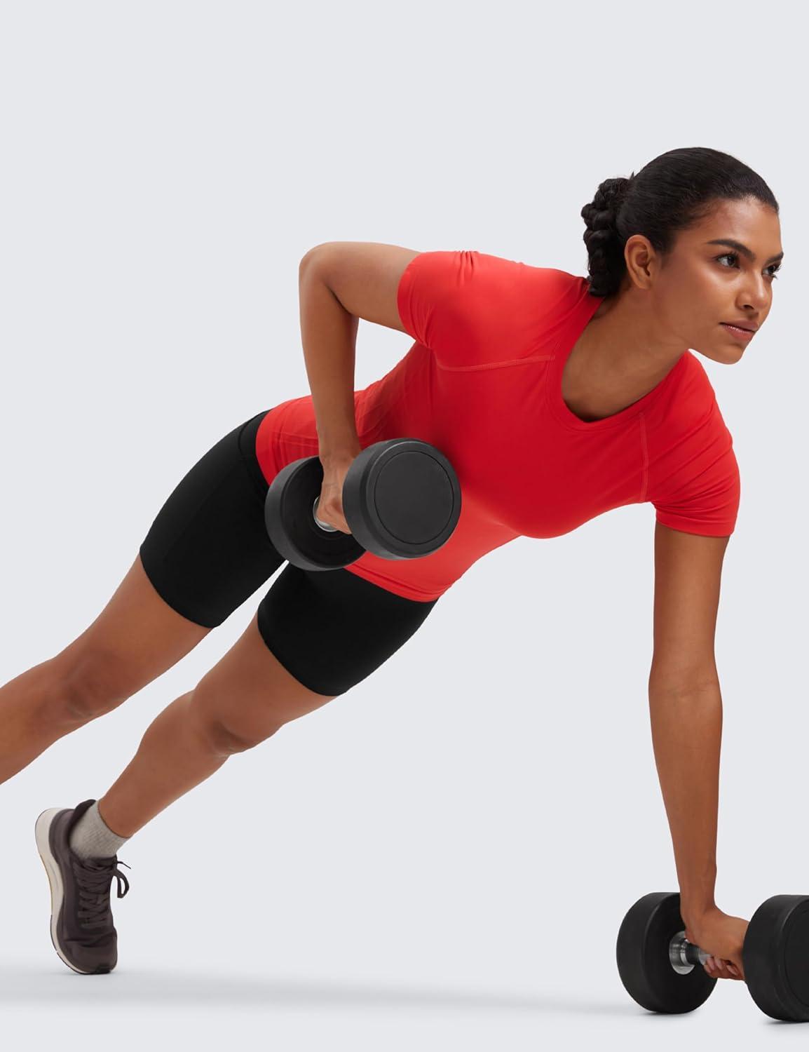 CRZ YOGA Seamless Workout Tops for Women Hip Length – Athletic Running Gym Yoga Short Sleeve Shirts Breathable Crewneck Tees(Deep Red)
